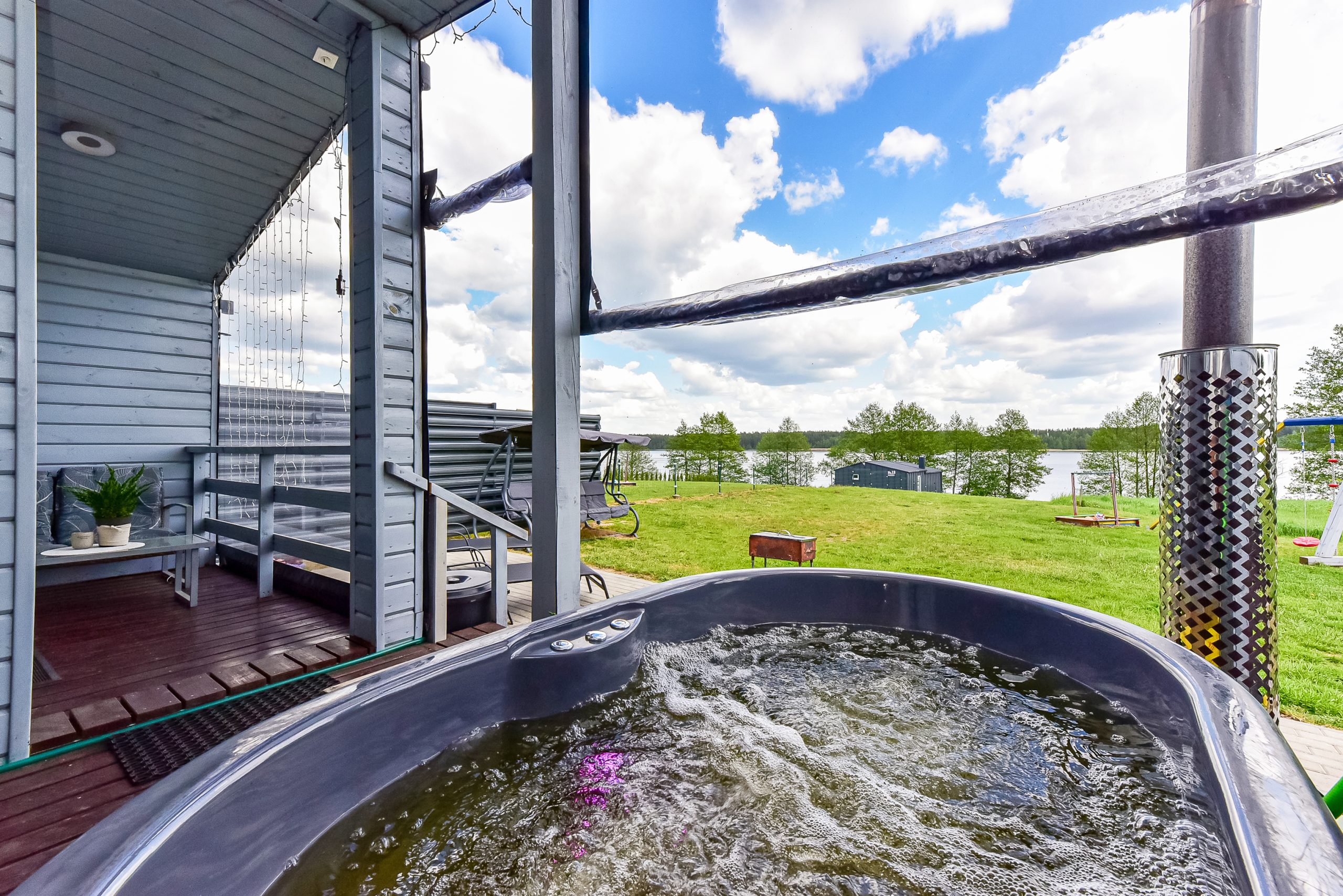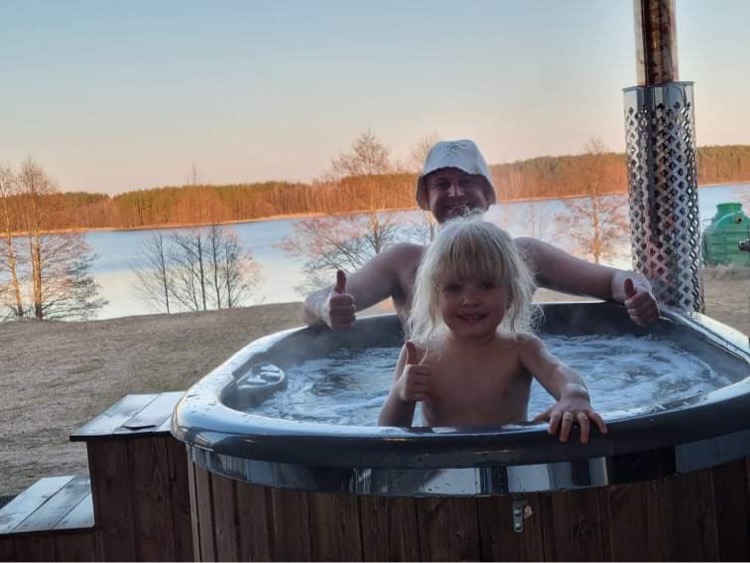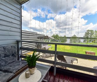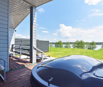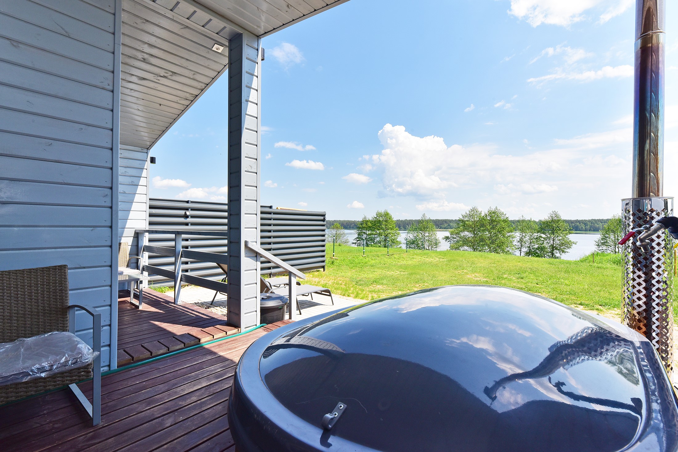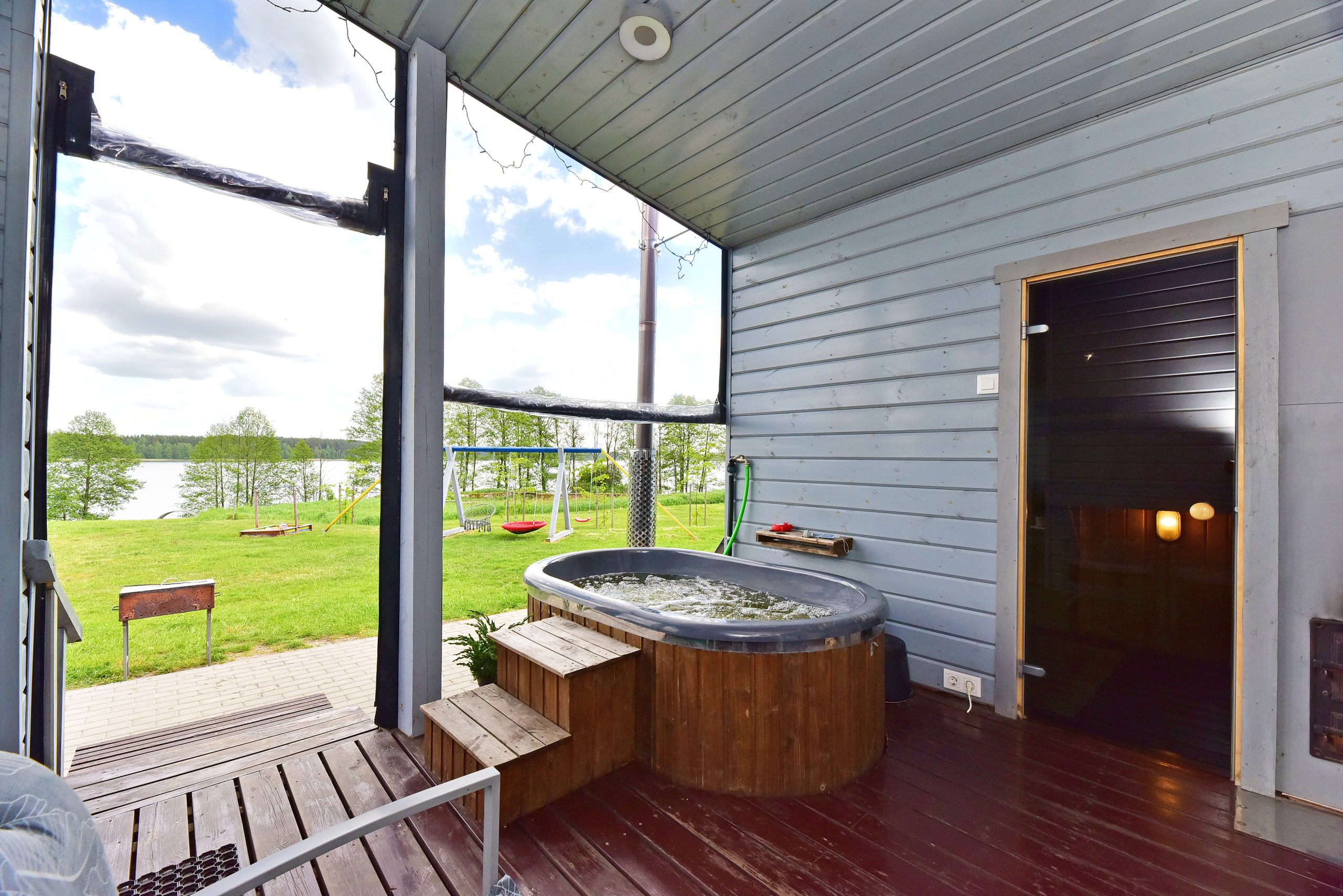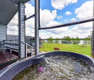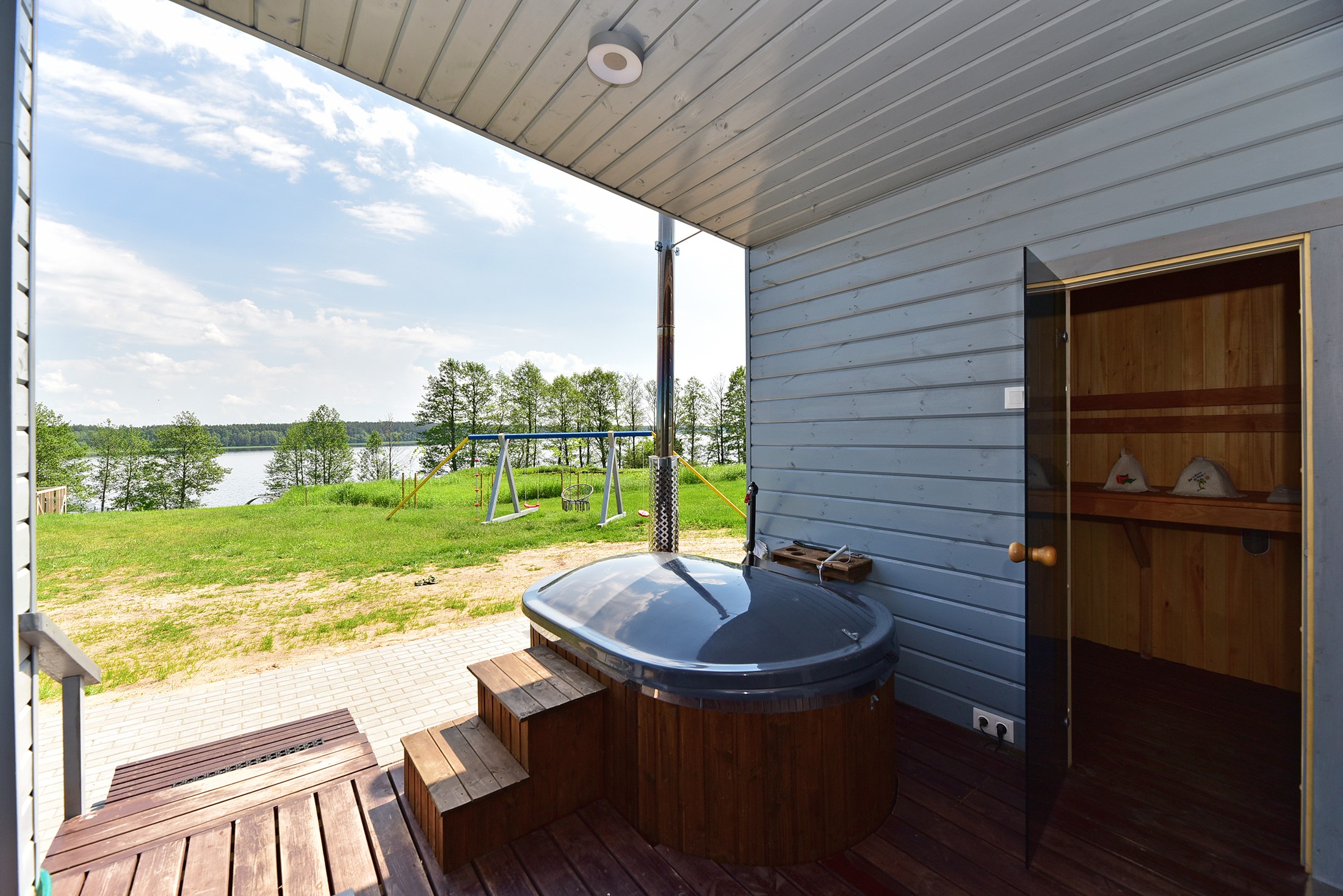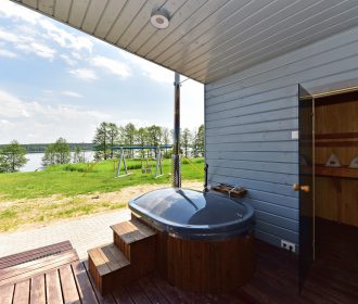 - Lauko pramogos: Erdvė su terasa, ofūro vonia ir garine pirtimi, iš kurios atsiveria graži panorama į ežerą.