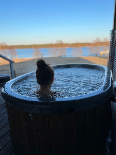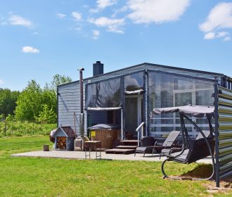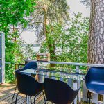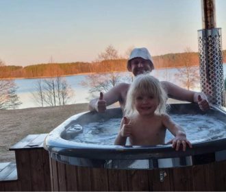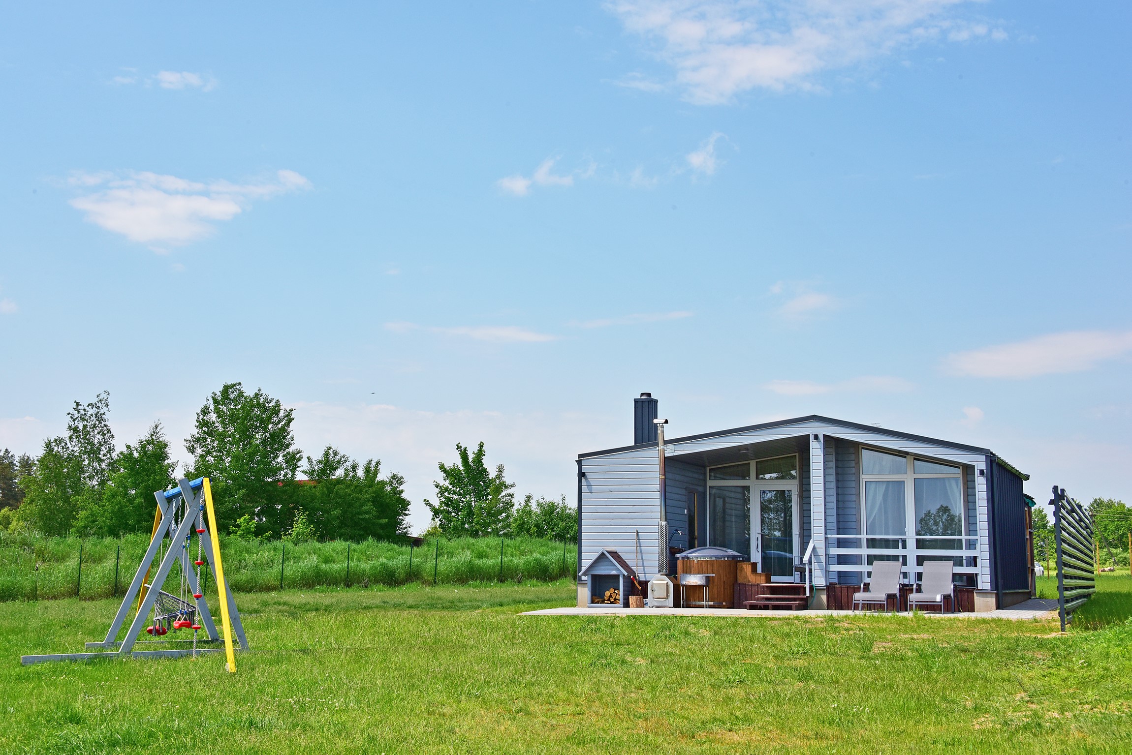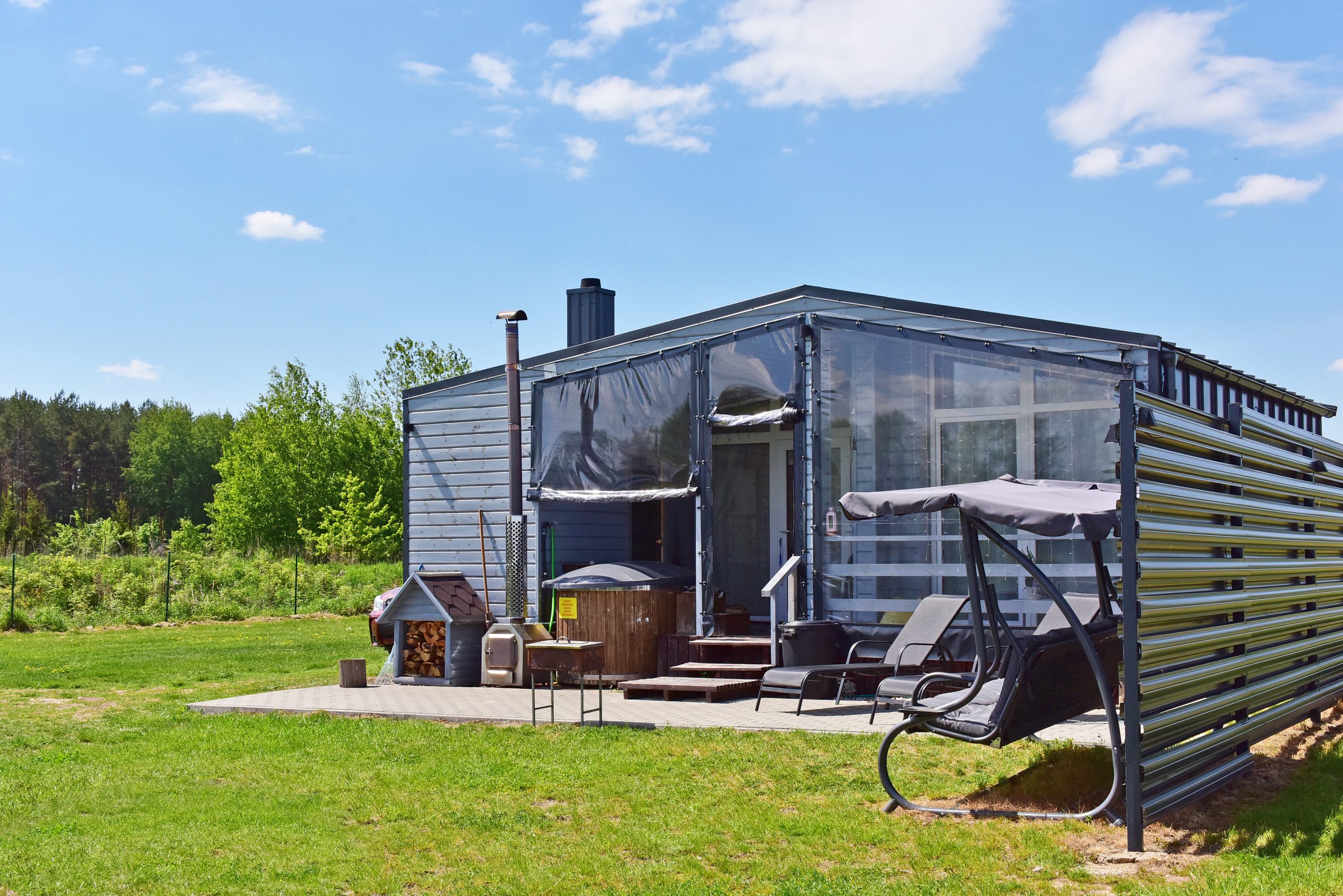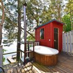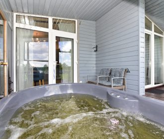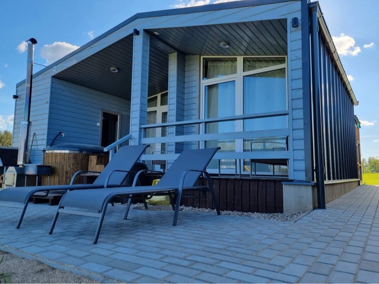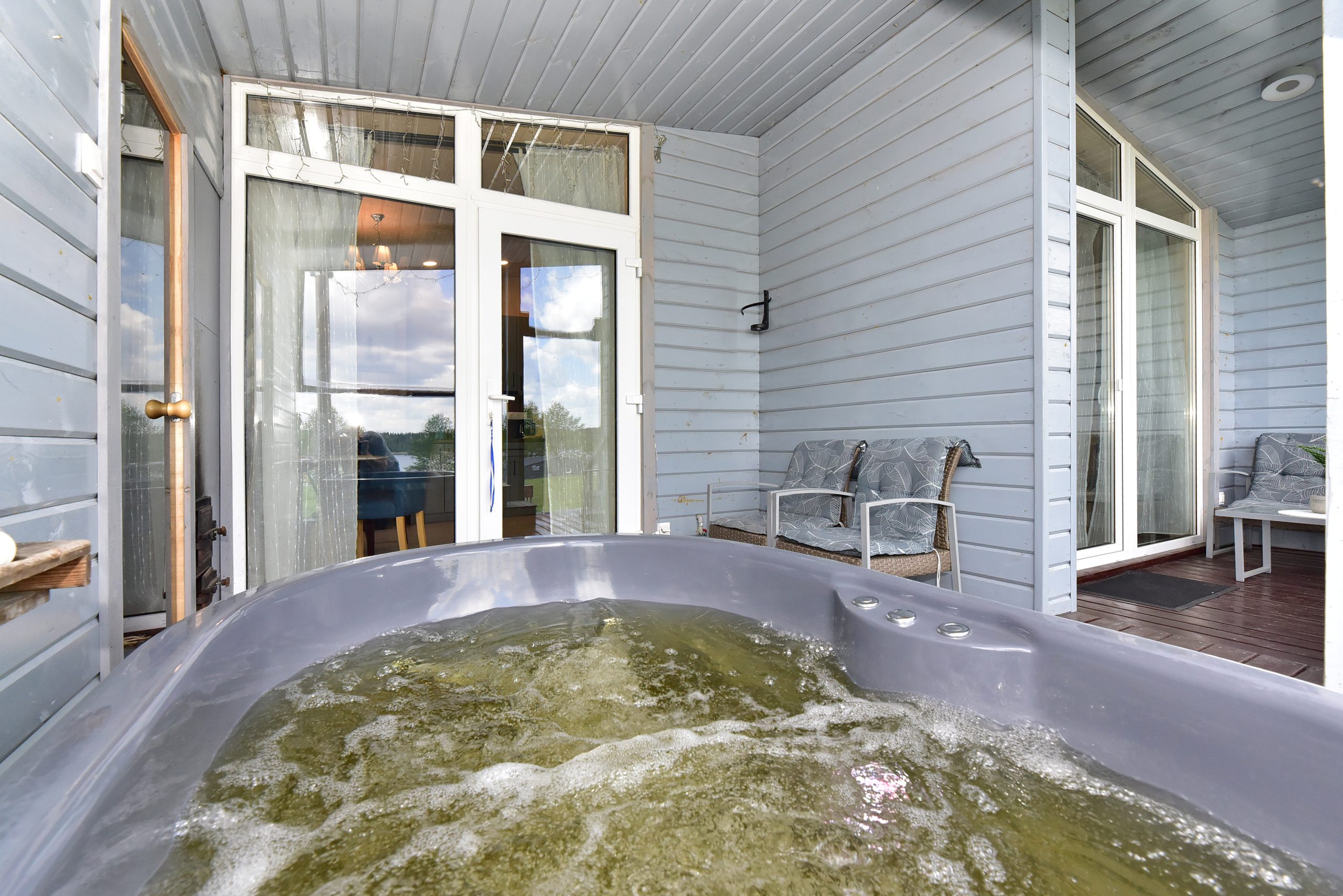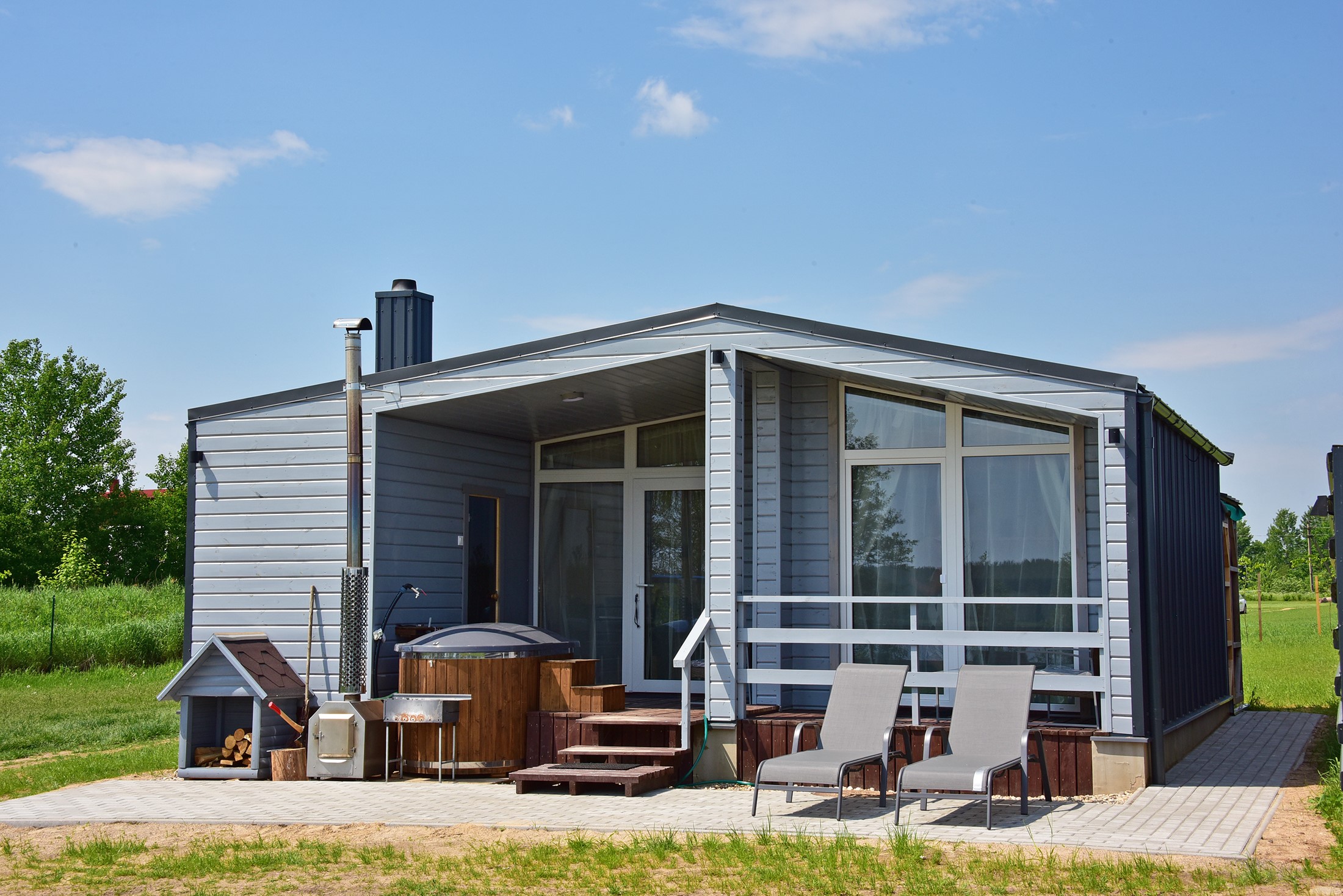 - Lauko pramogos: Erdvė su terasa, ofūro vonia ir garine pirtimi, iš kurios atsiveria graži panorama į ežerą.