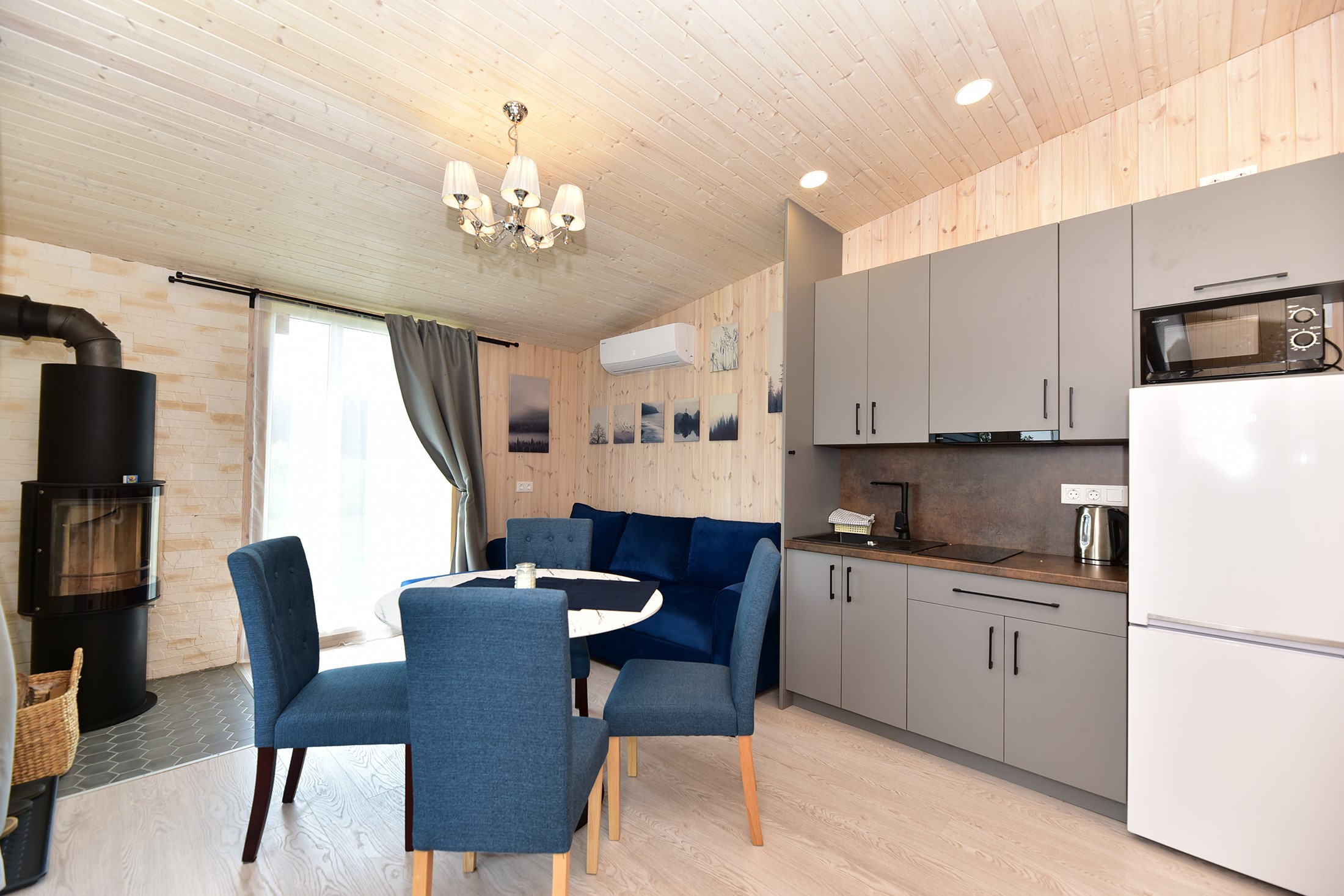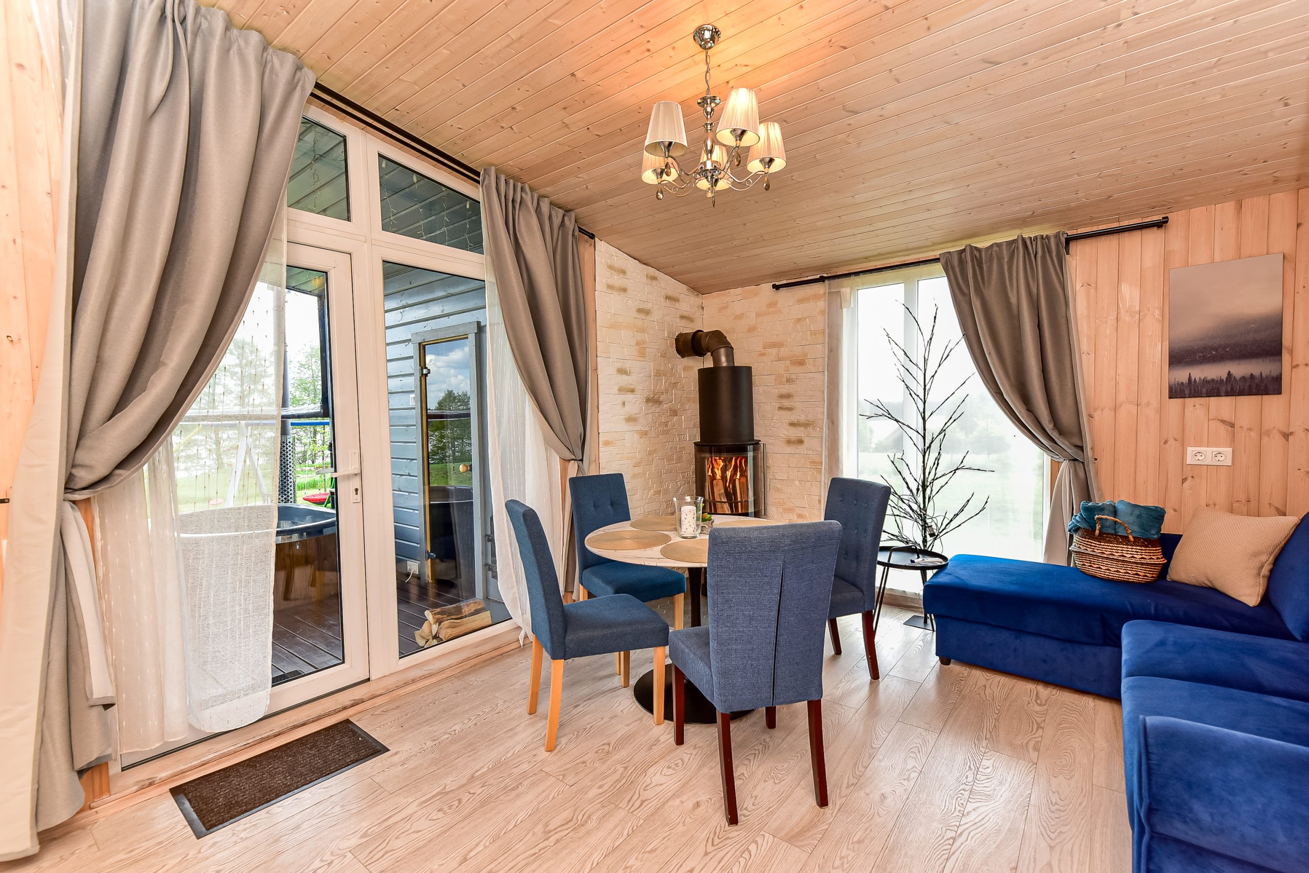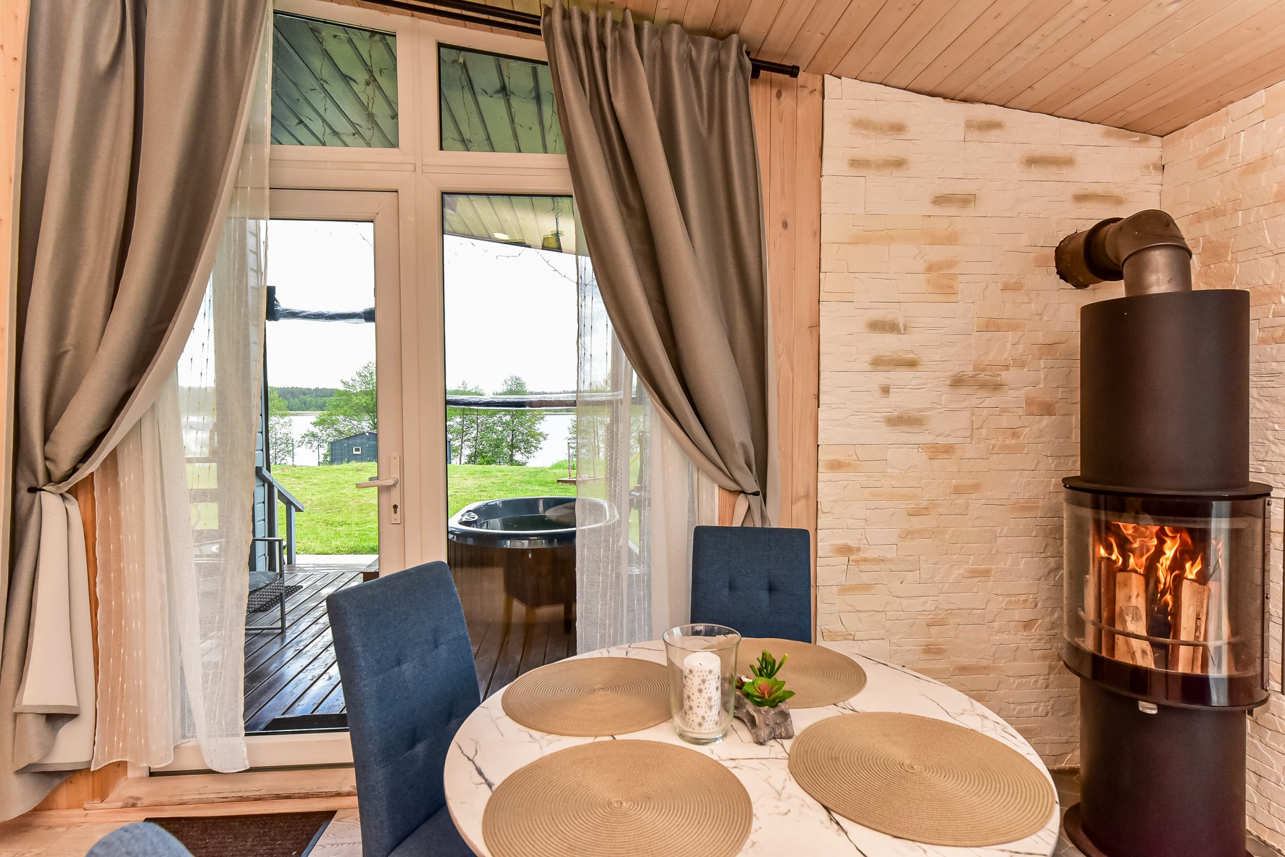 - Jaukus interjeras: Svetainė su židiniu, LED išmanusiu televizoriumi, patogiu išskleidžiamu kampu. Atskiras miegamasis su dvigule lova ir televizoriumi.