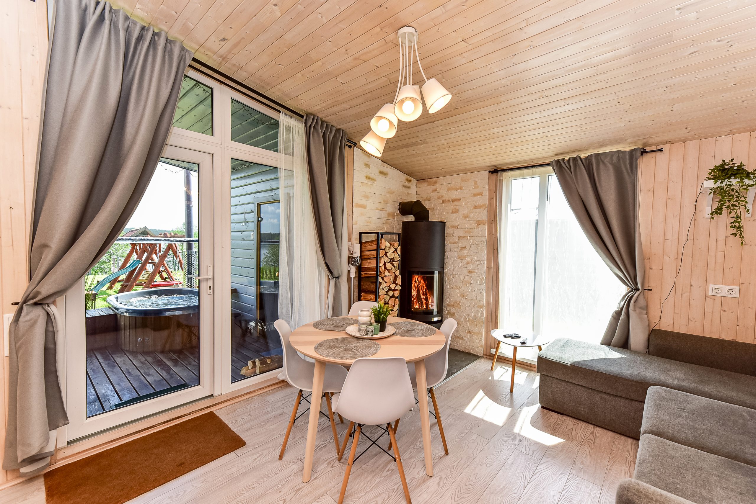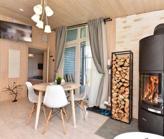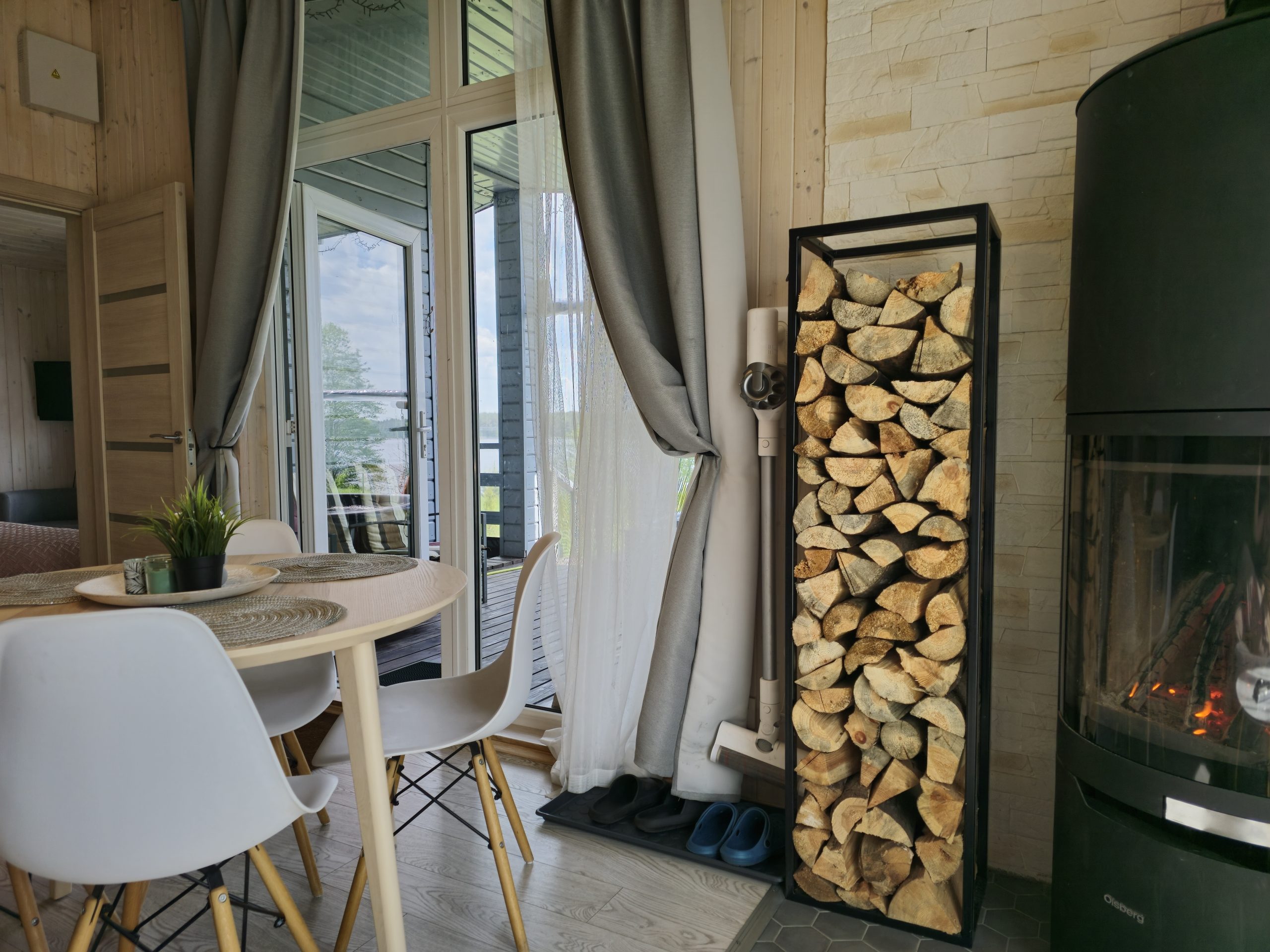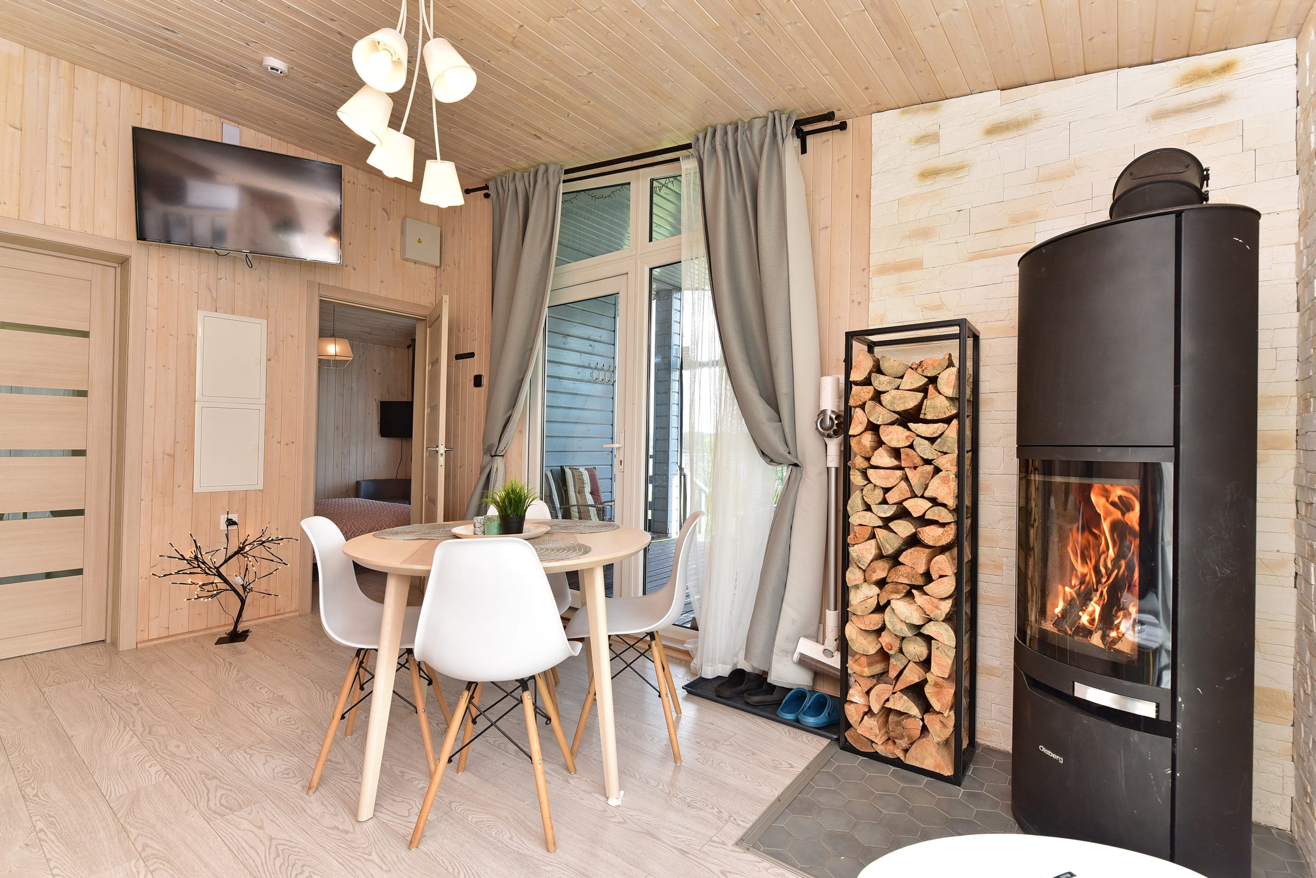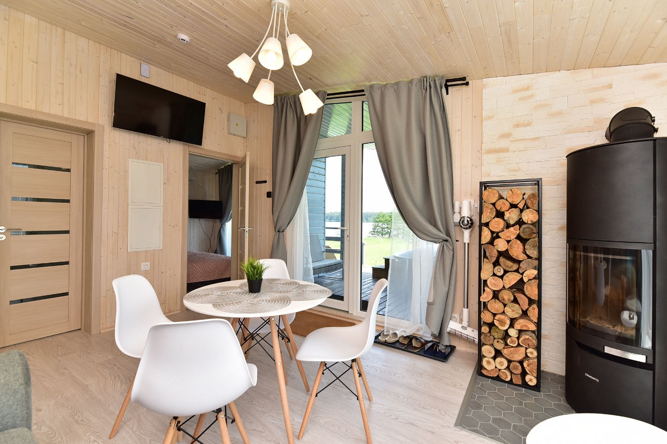 Namelyje svetainė su virtuve, atskiras miegamasis bei san. mazgo patalpa (dušas, tualetas). Svetainėje židinys, LED išmanusis televizorius prijungtas prie interneto, minkštas, patogus išskleidžiamas kampas, virtuvėje šaldytuvas, kaitlentė, mikrobangų krosnelė, visi indai, įrankiai. Miegamajame didelė dvigulė lova, LED televizorius. Namelyje veikia nemokamas bevielis internetas (Wi-Fi).