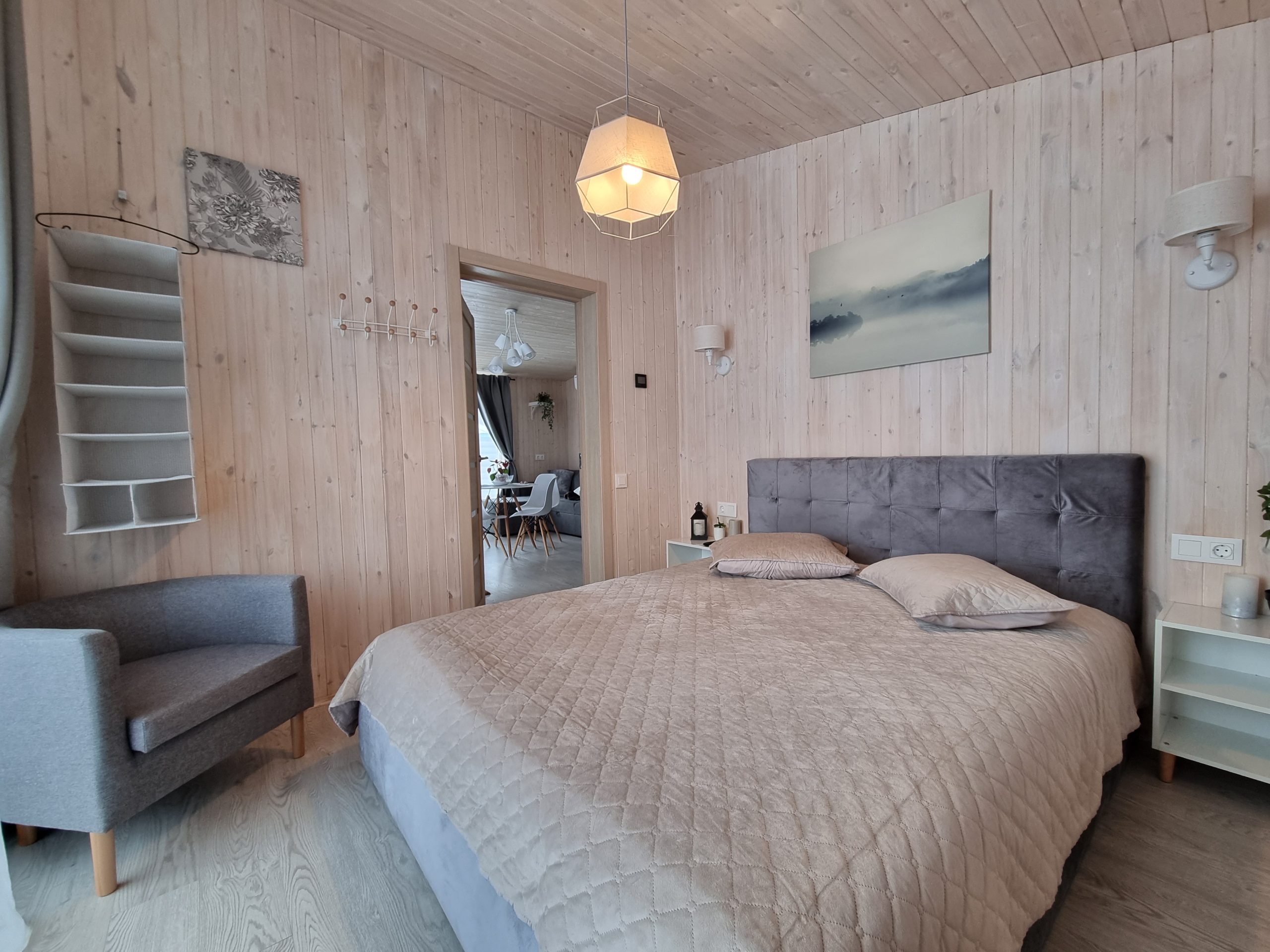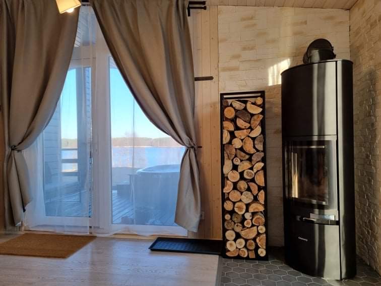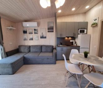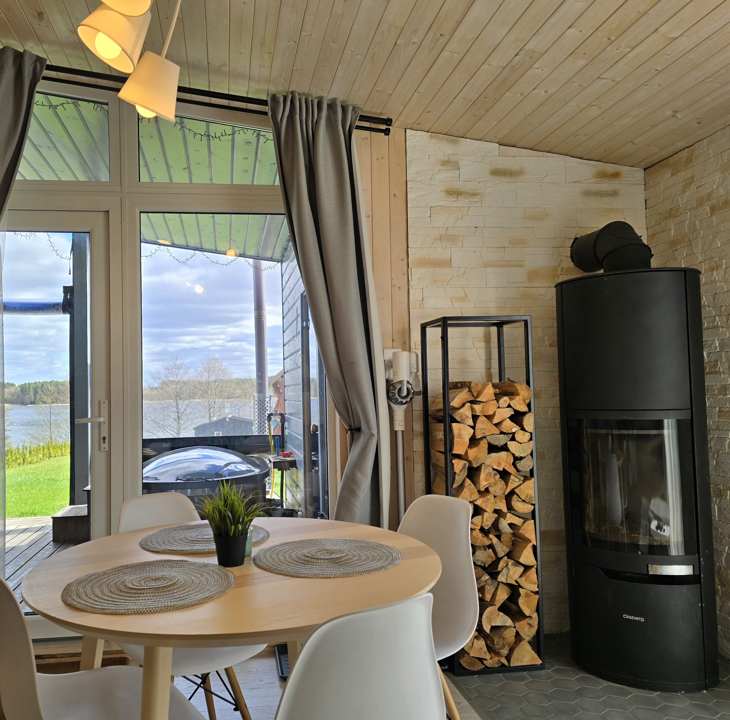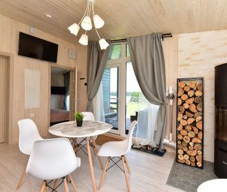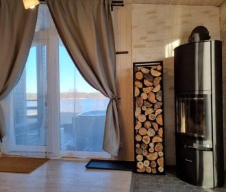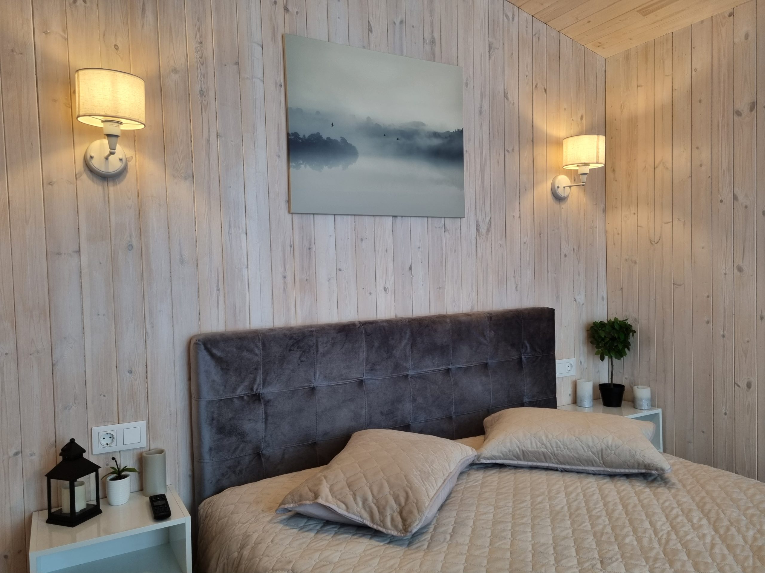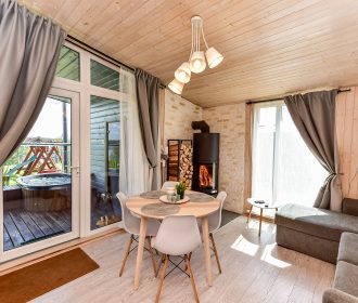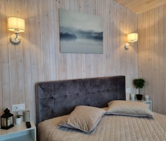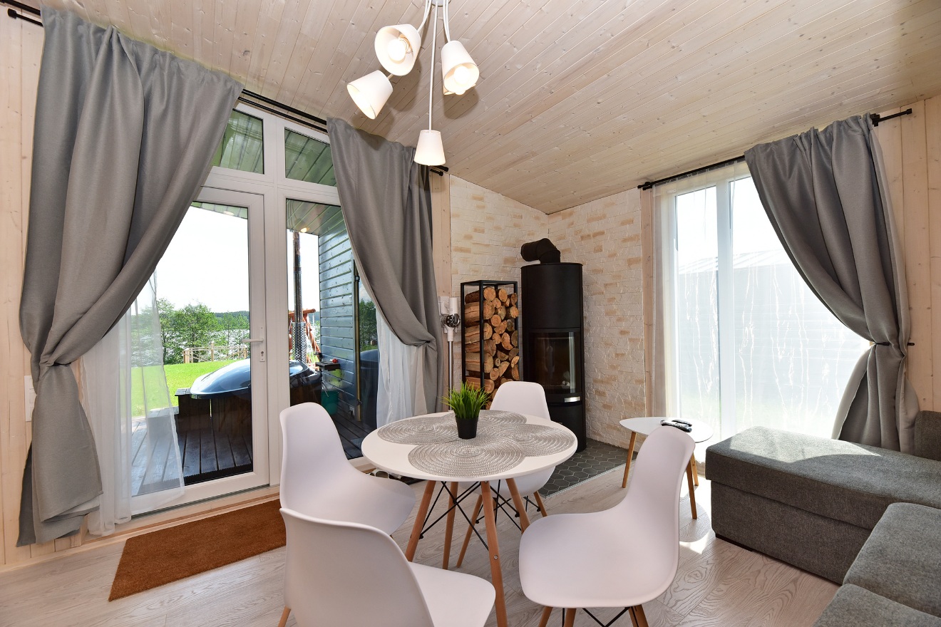 Namelyje svetainė su virtuve, atskiras miegamasis bei san. mazgo patalpa (dušas, tualetas). Svetainėje židinys, LED išmanusis televizorius prijungtas prie interneto, minkštas, patogus išskleidžiamas kampas, virtuvėje šaldytuvas, kaitlentė, mikrobangų krosnelė, visi indai, įrankiai. Miegamajame didelė dvigulė lova, LED televizorius. Namelyje veikia nemokamas bevielis internetas (Wi-Fi).
