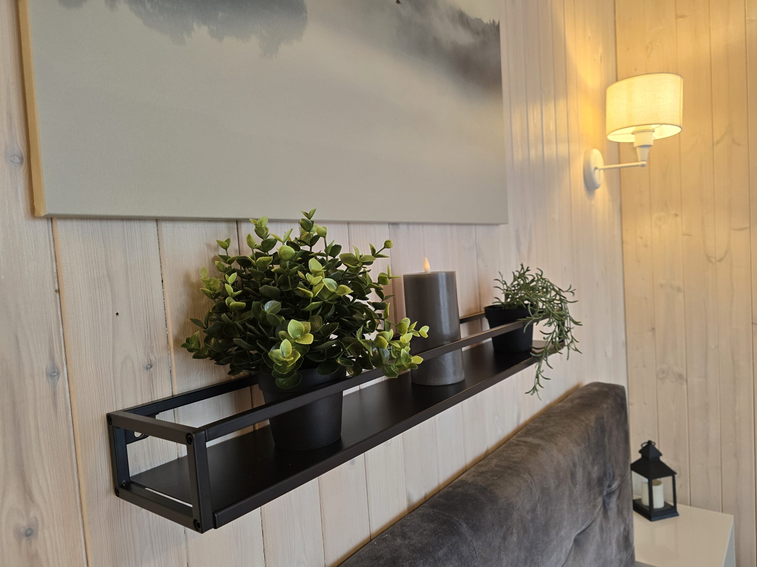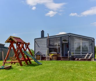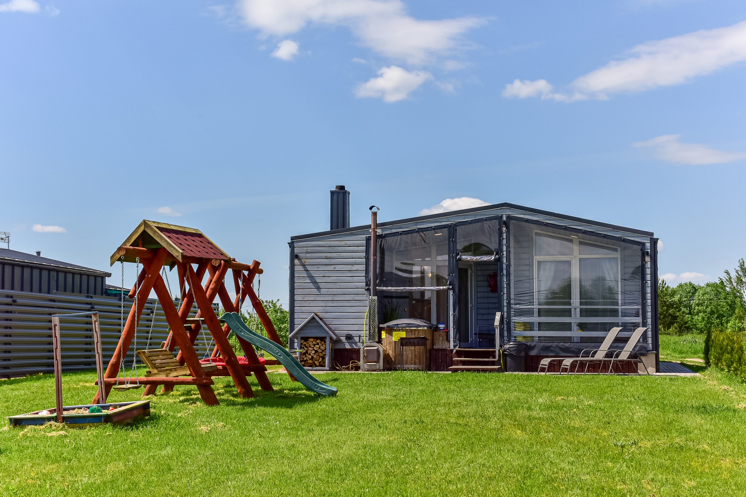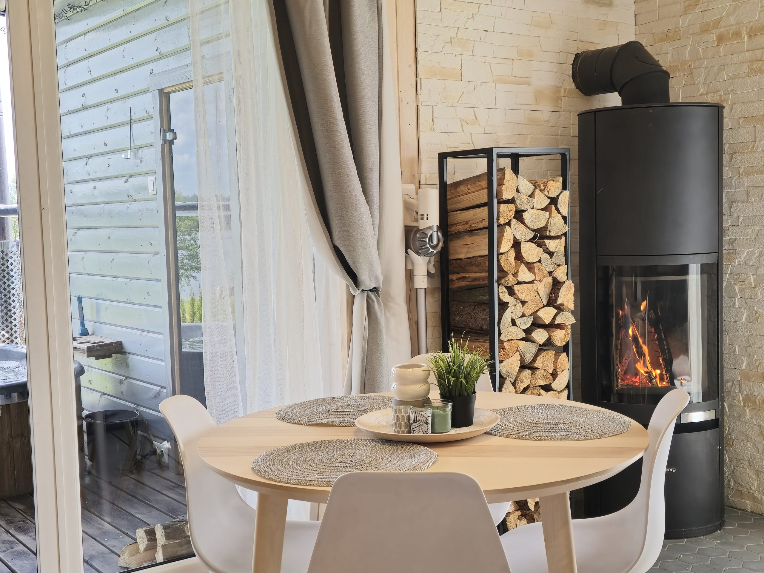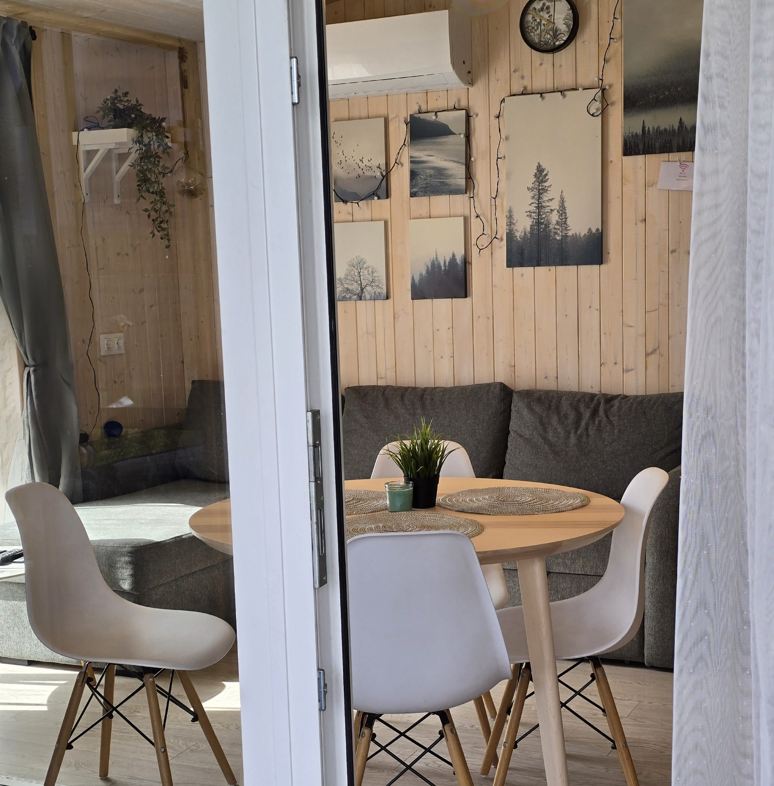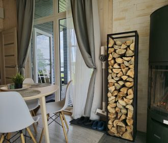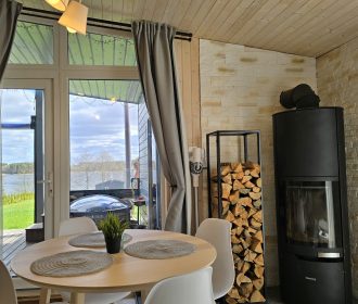 Namelyje svetainė su virtuve, atskiras miegamasis bei san. mazgo patalpa (dušas, tualetas). Svetainėje židinys, LED išmanusis televizorius prijungtas prie interneto, minkštas, patogus išskleidžiamas kampas, virtuvėje šaldytuvas, kaitlentė, mikrobangų krosnelė, visi indai, įrankiai. Miegamajame didelė dvigulė lova, LED televizorius. Namelyje veikia nemokamas bevielis internetas (Wi-Fi).