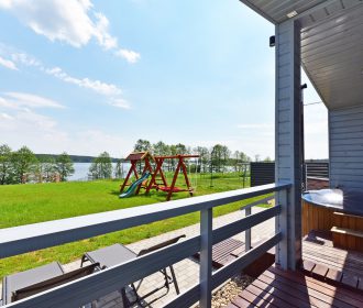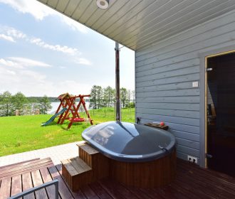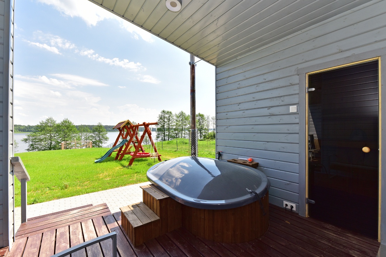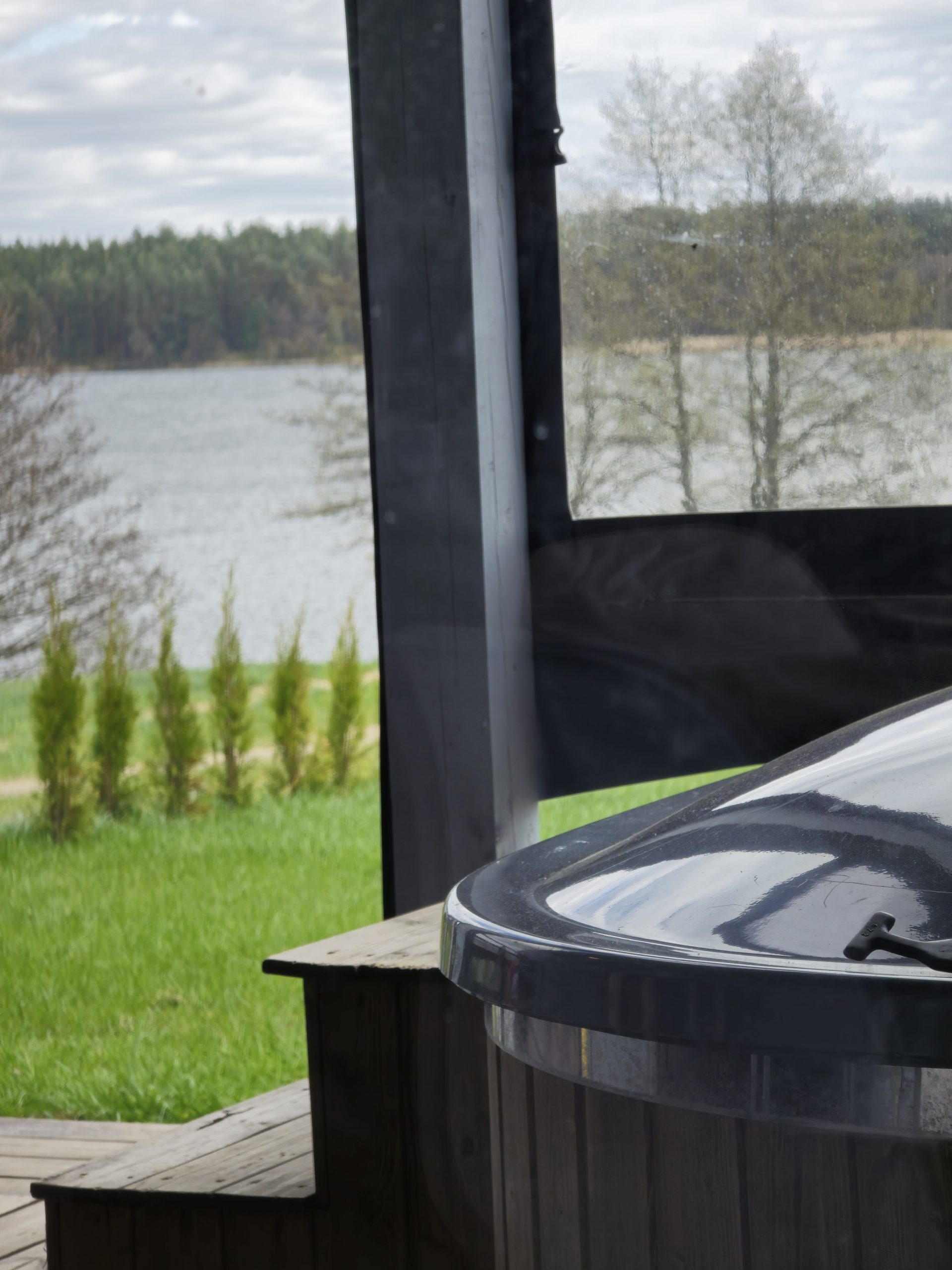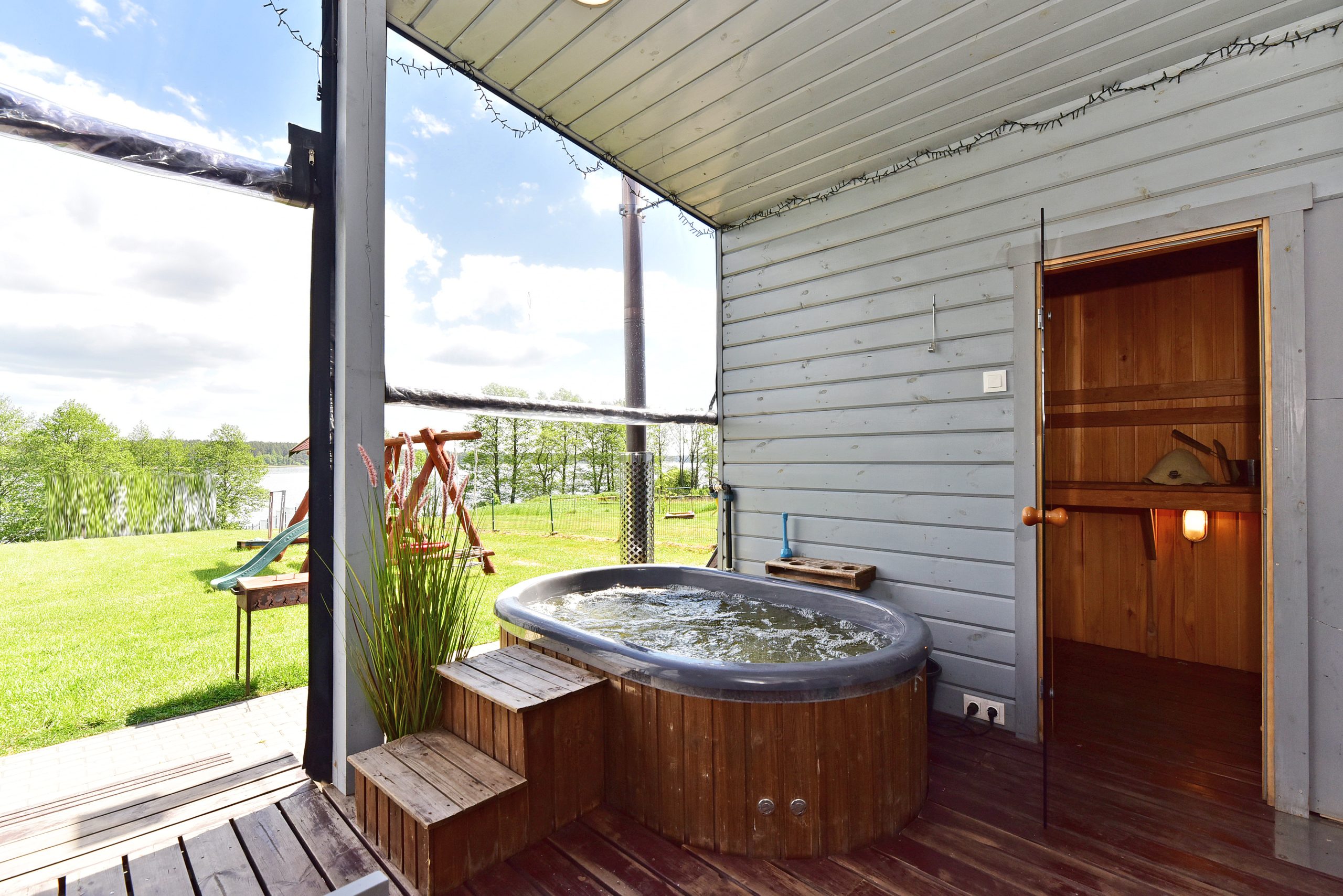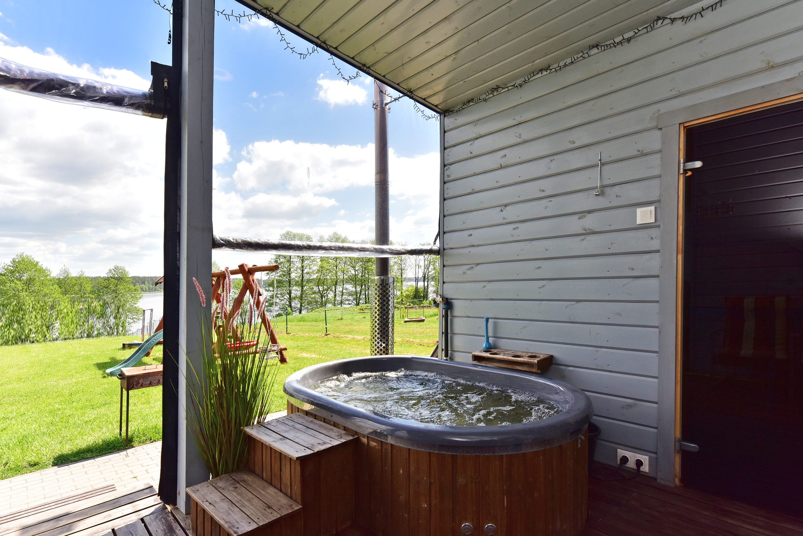 Lauko terasoje įrenga ofūro vonia ir garinė pirtis. Graži panorama nuo kalno į ežerą.