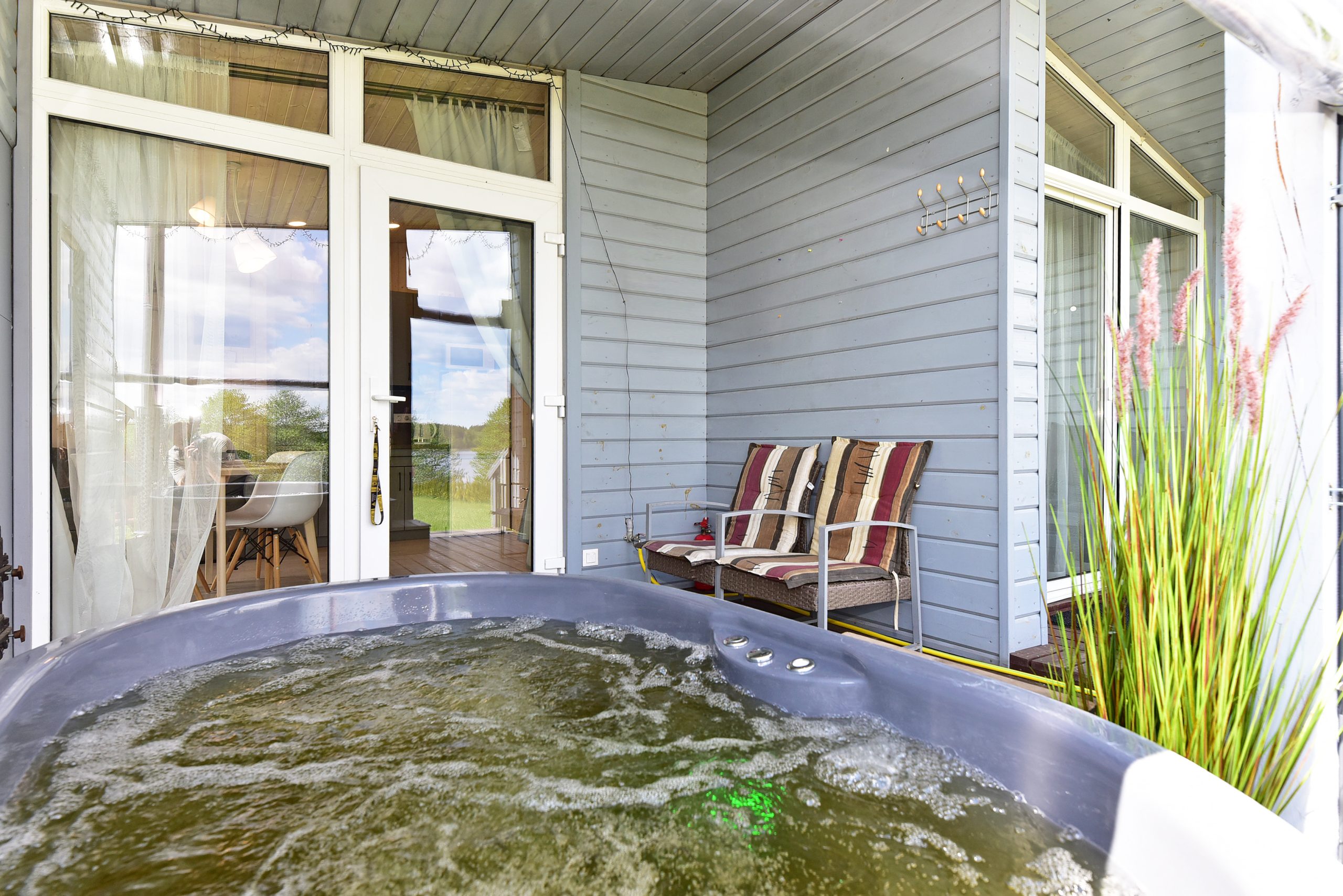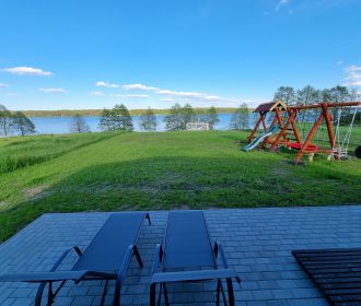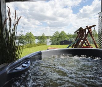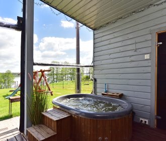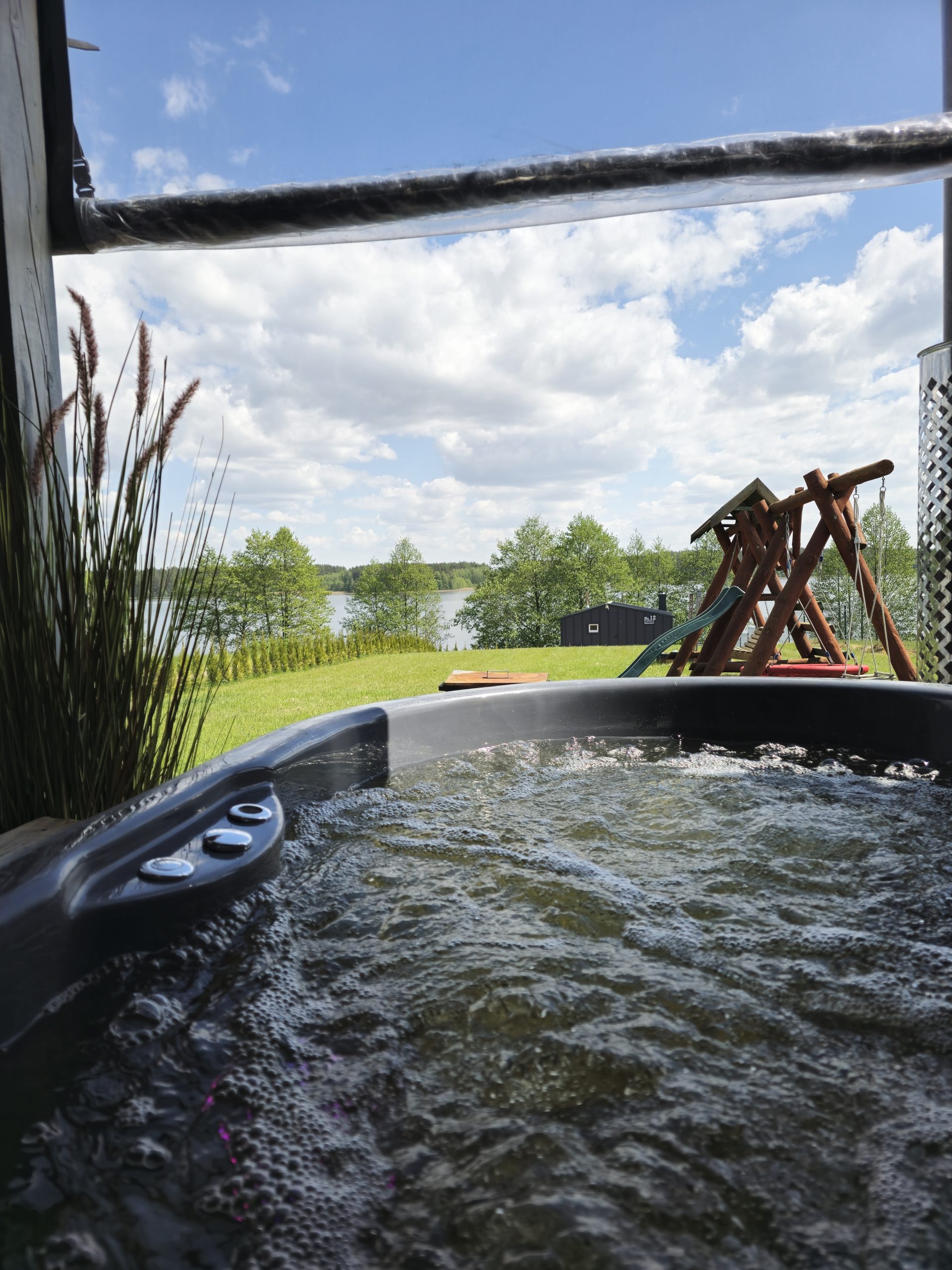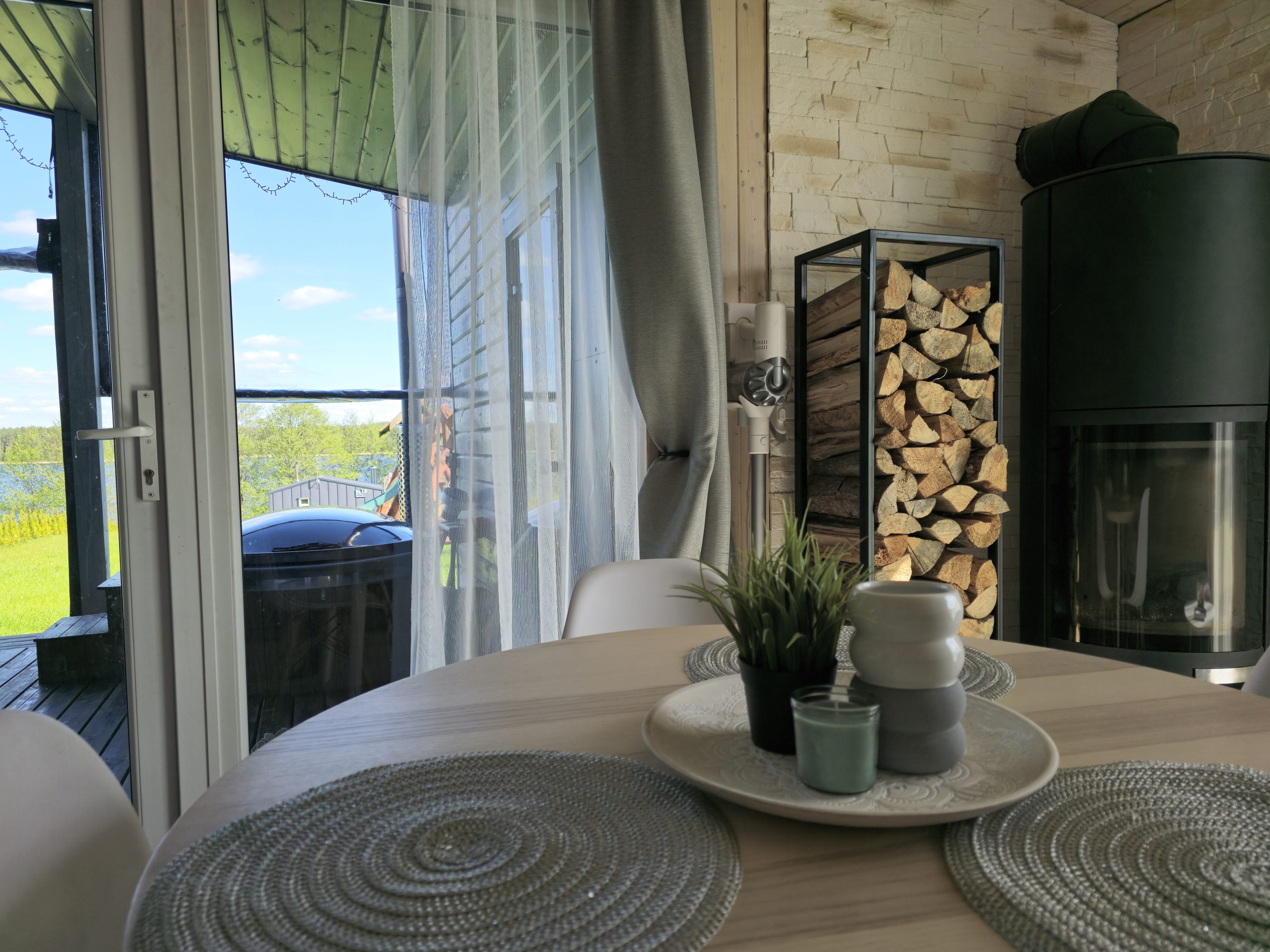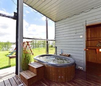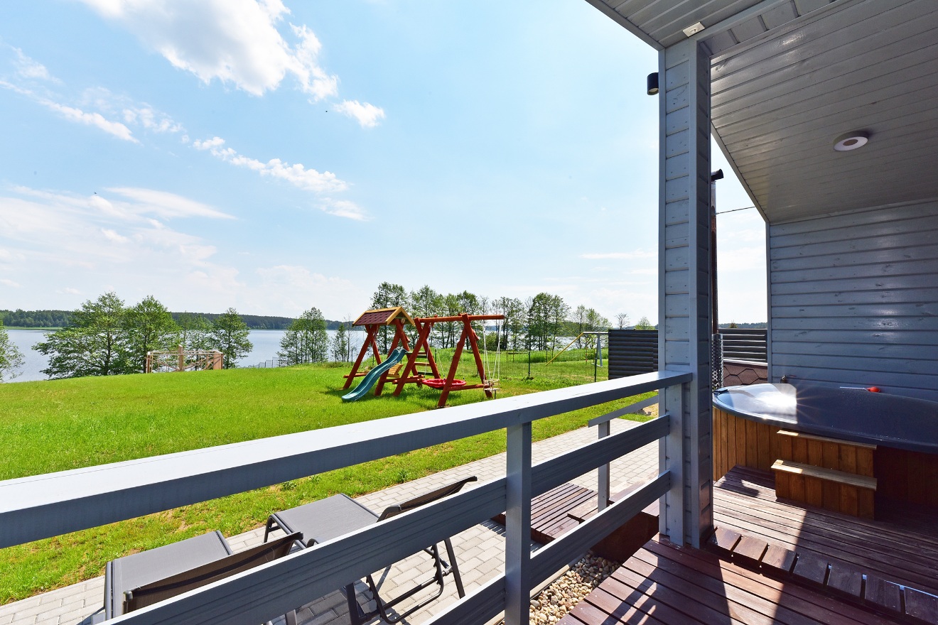 Lauko terasoje įrenga ofūro vonia ir garinė pirtis. Graži panorama nuo kalno į ežerą.