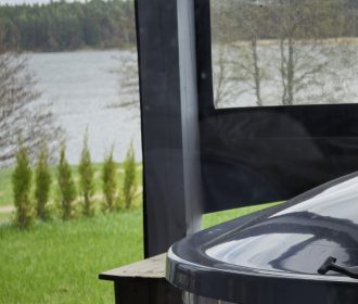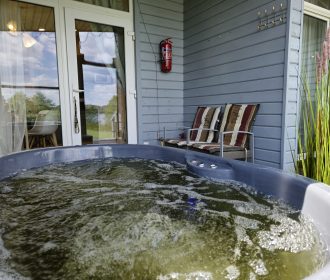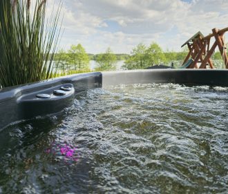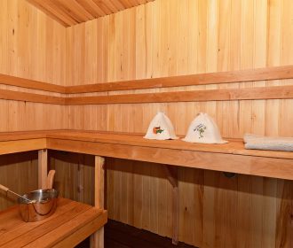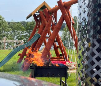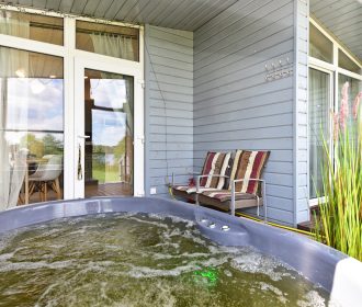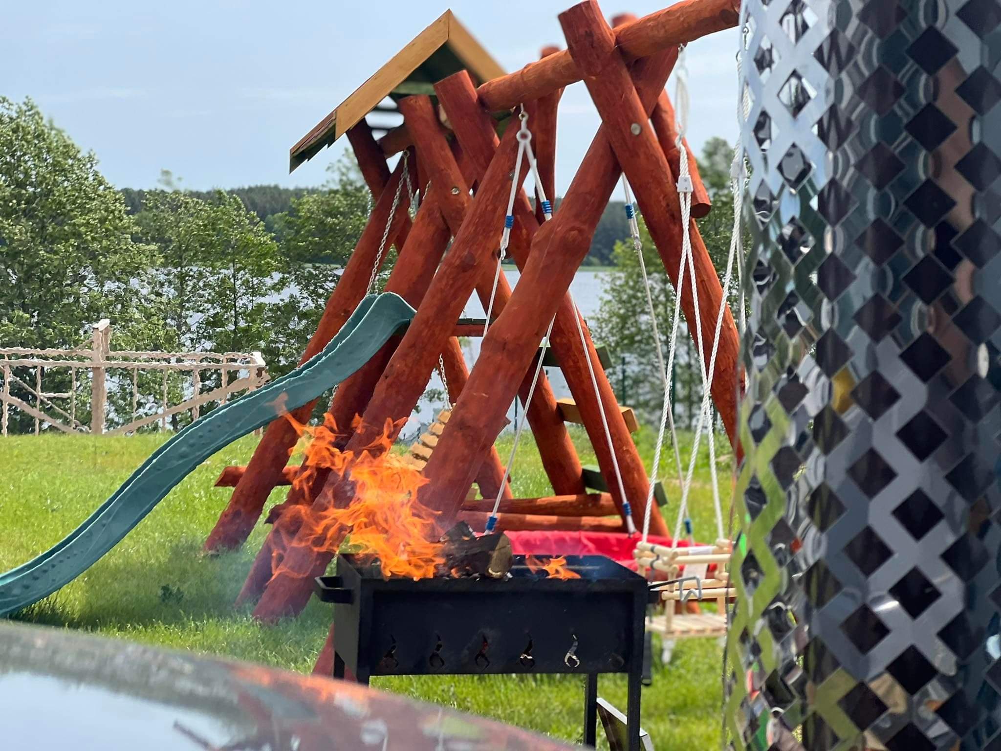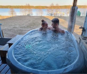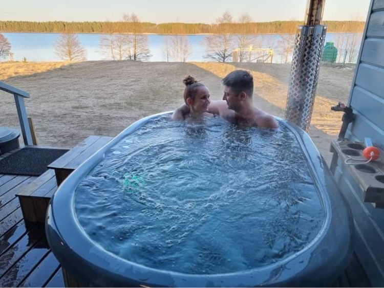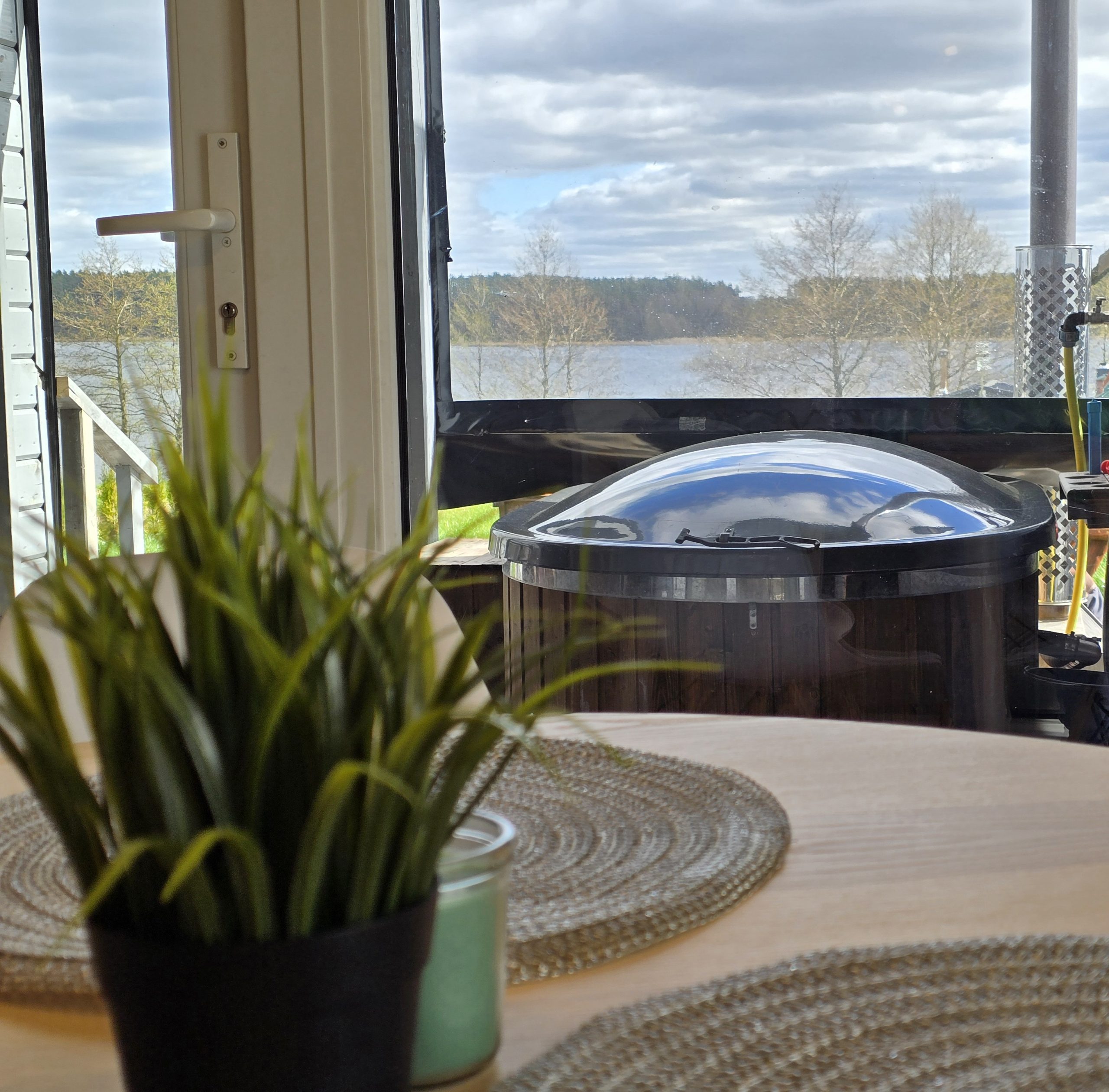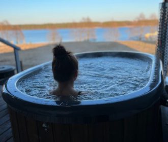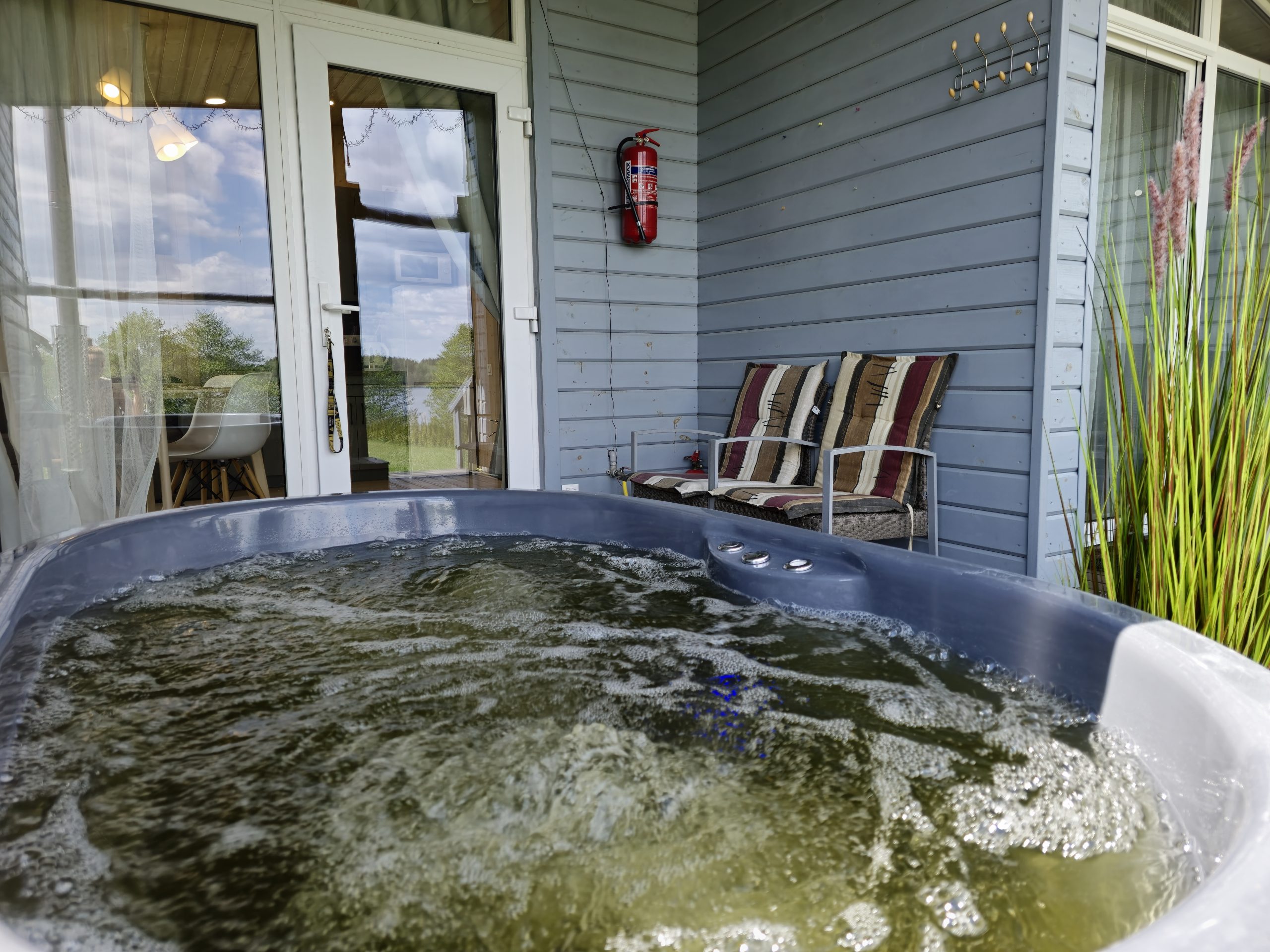 Lauko terasoje įrenga ofūro vonia ir garinė pirtis. Graži panorama nuo kalno į ežerą.