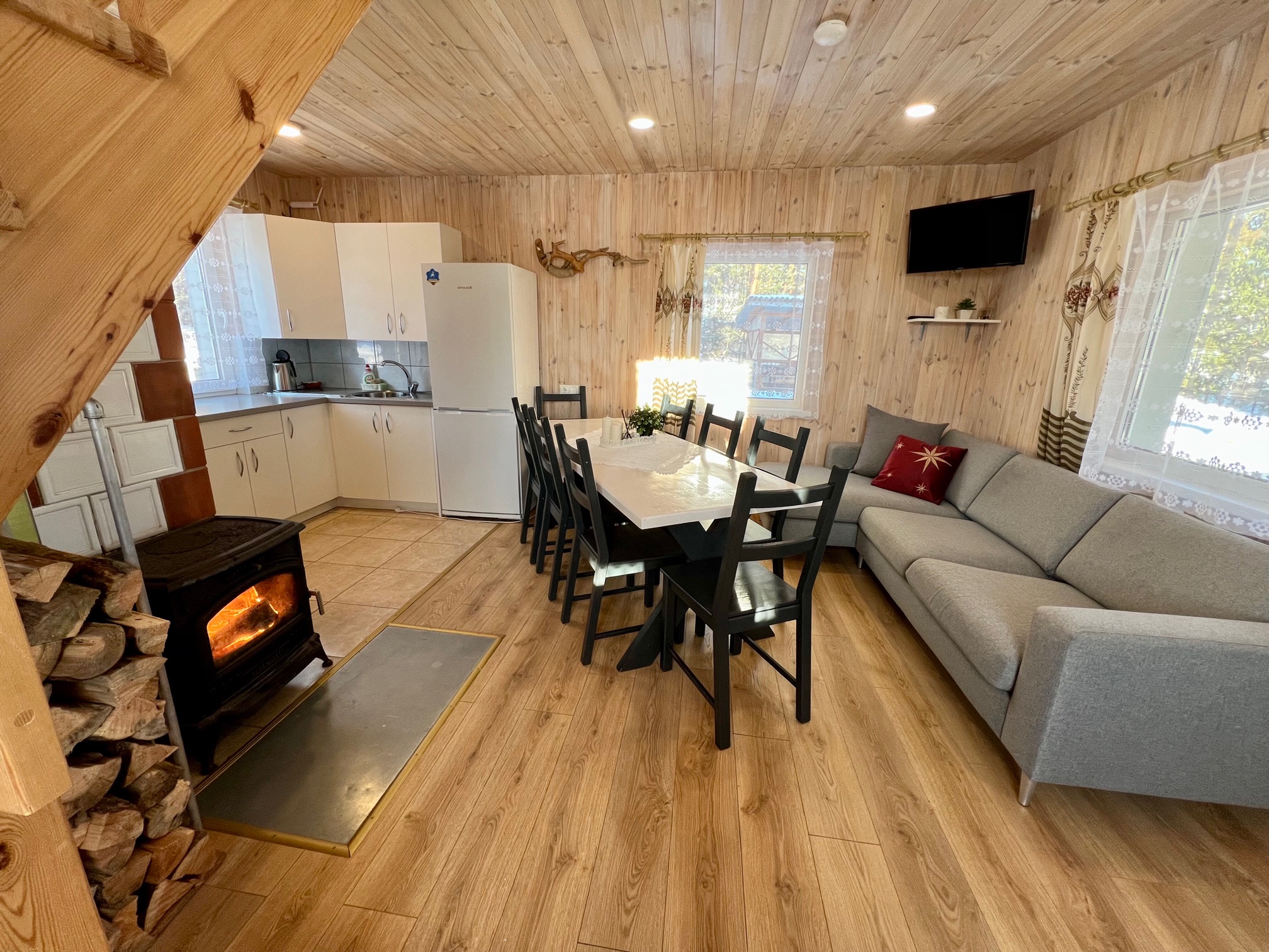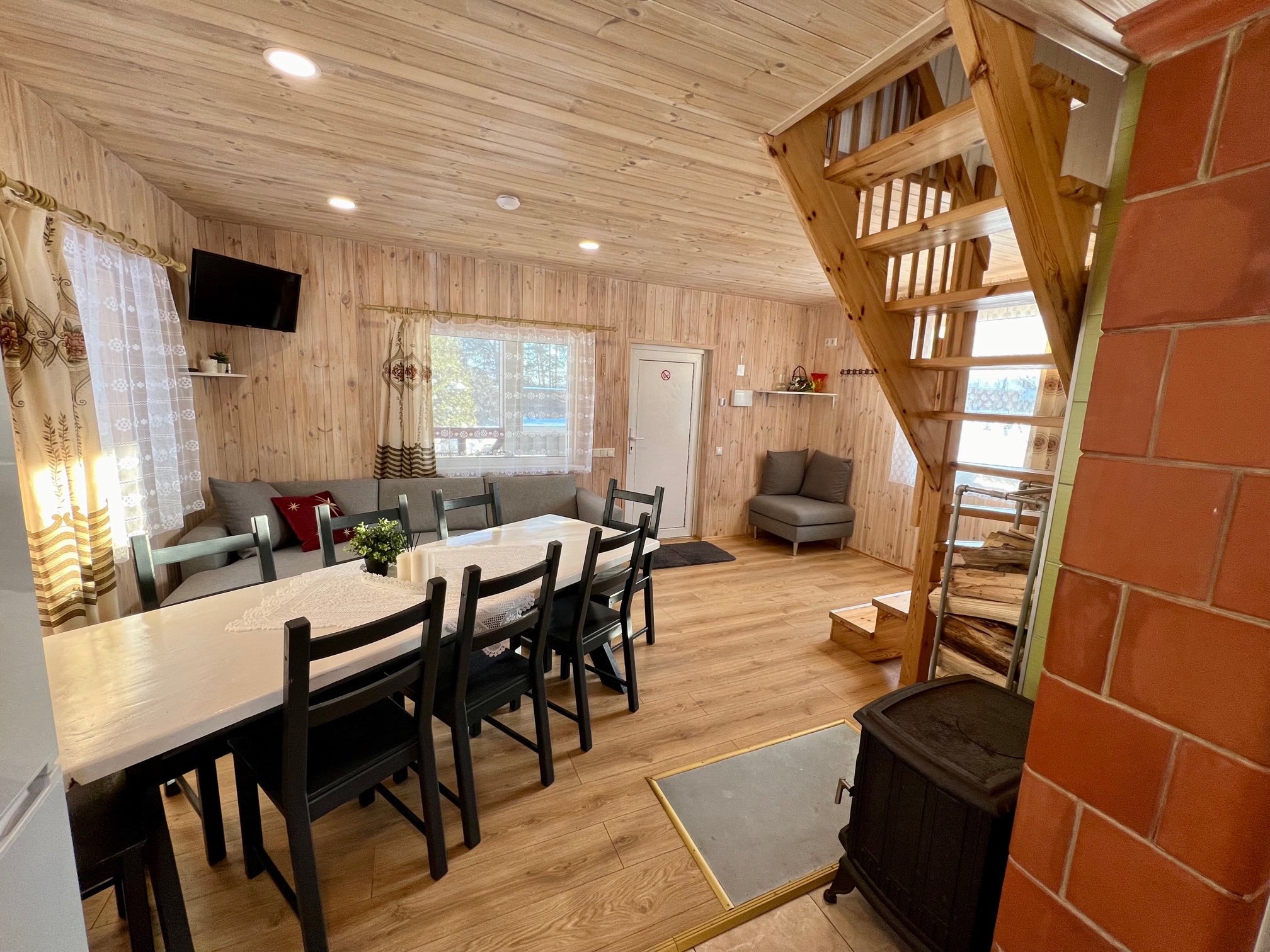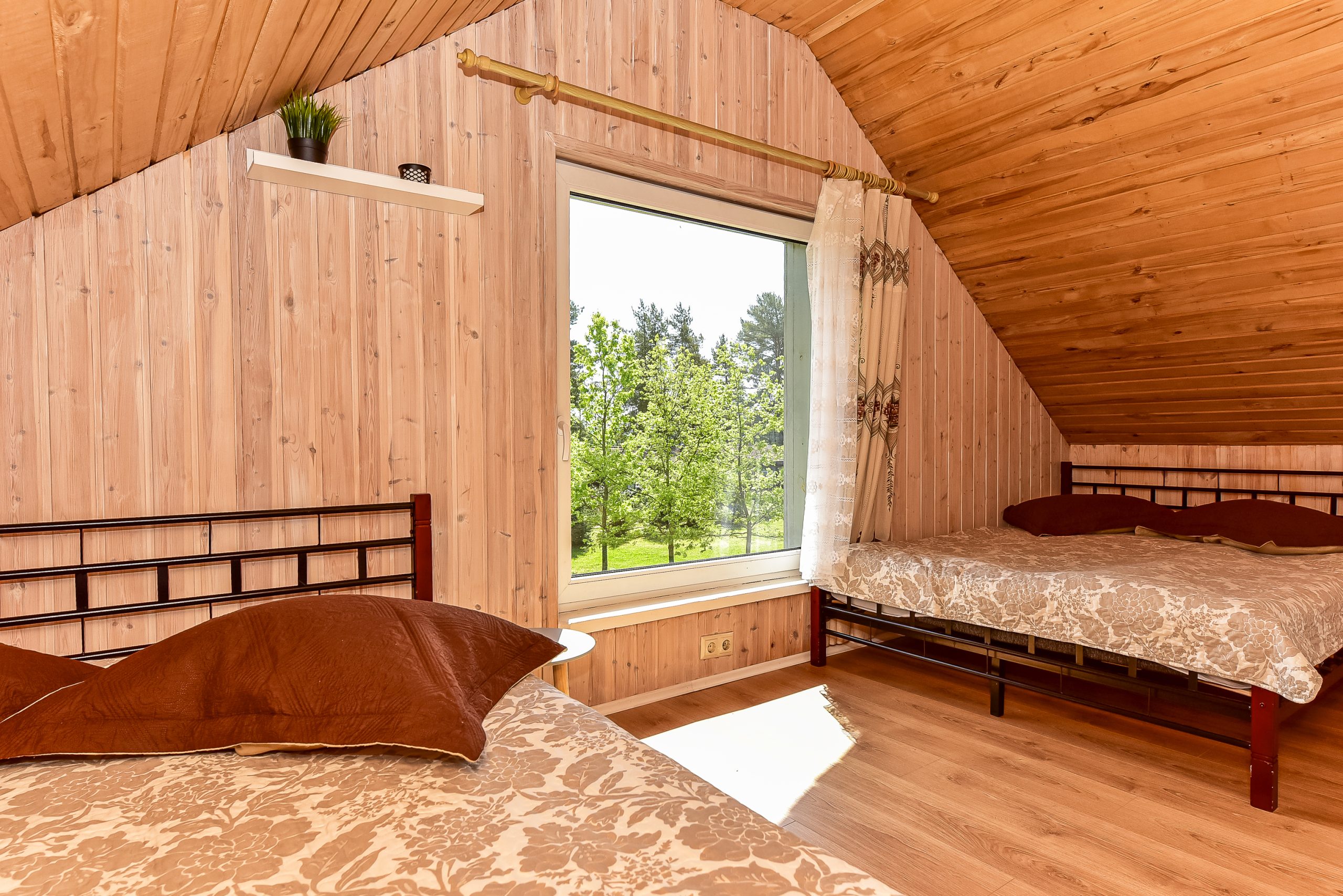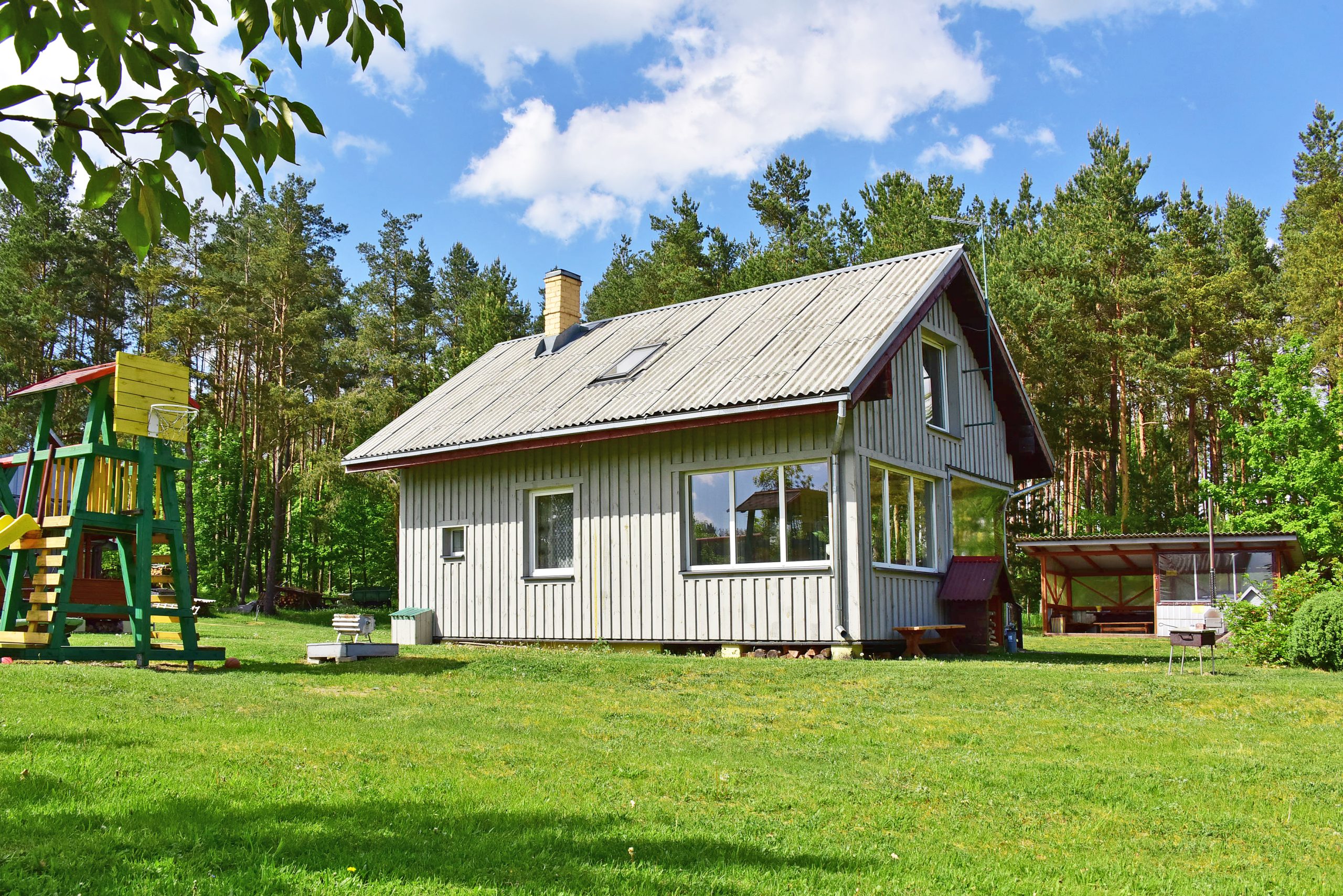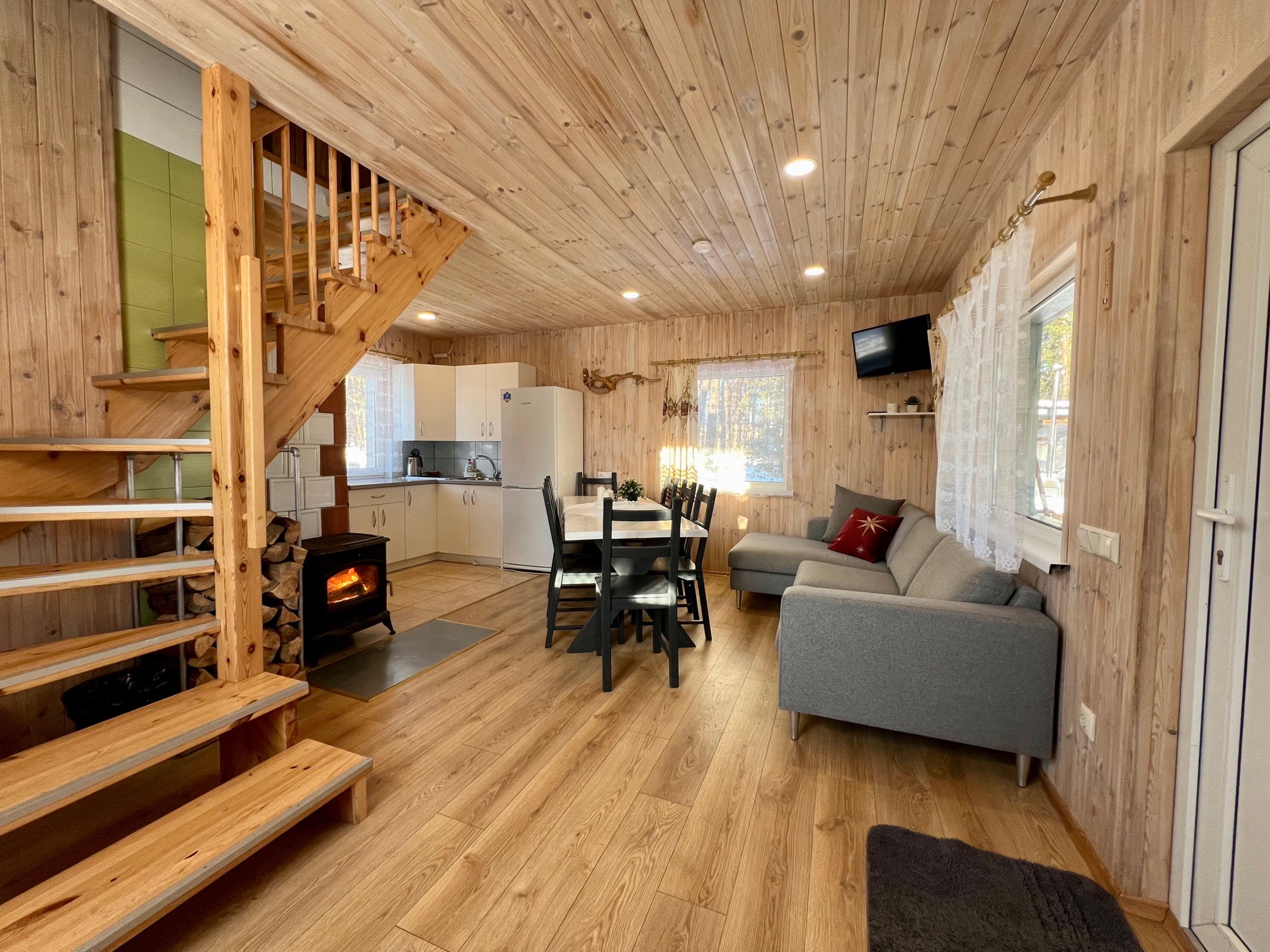 Pirmame aukšte įrengta svetainė su virtuve, tualetas, dušas. Antrame aukšte trys kambariai (vienas pereinamas), viso 10 miegamų vietų. Yra kondicionierius, internetas (WIFI). Įrengta terasa. Šalia namelio pavėsinė su kubilu, vaikų žaidimų aikštelė. Duodama šašlykinė, iešmai, malkos.