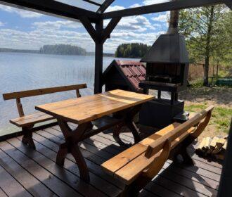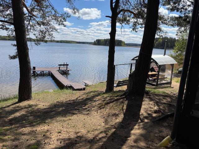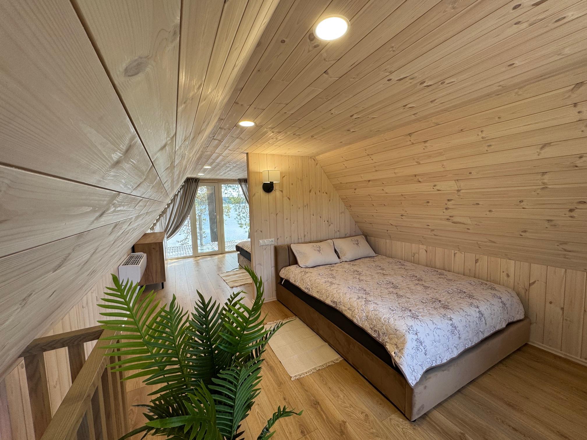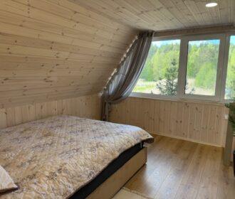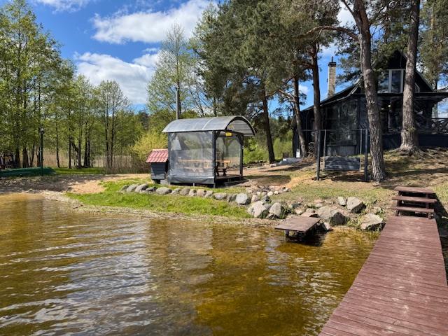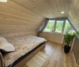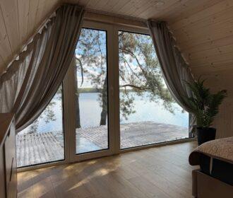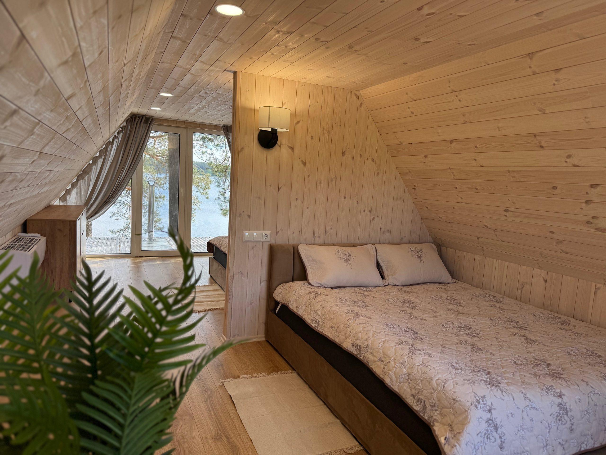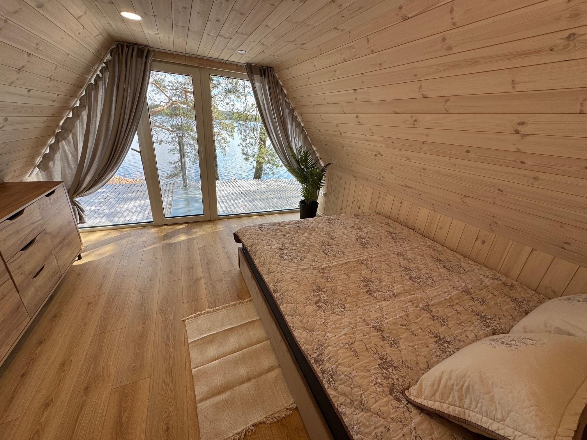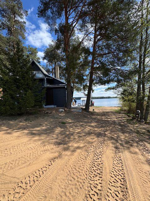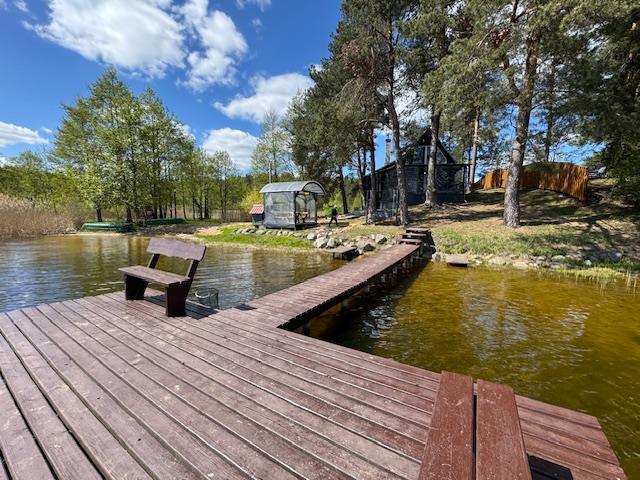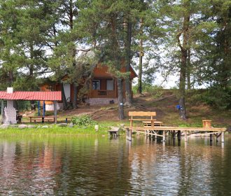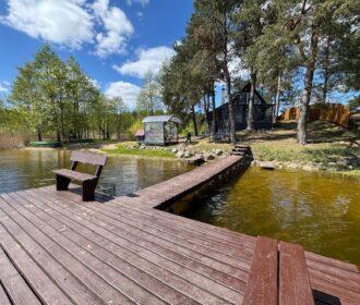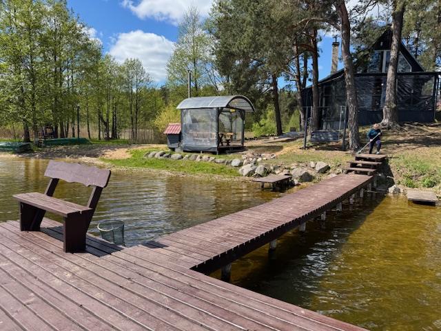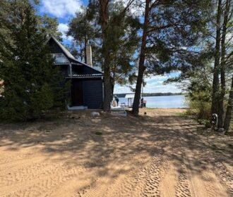 Visiškai ant ežero kranto su privačia pakrante. Pirmame aukšte svetainė, virtuvė, tualetas dušas. Yra židinys, televizorius, internetas, įrengtas kondicionierius. Antrame aukšte vienas kambarys – 4 miegamos vietos (2 dvigulės lovos). Yra pirtis ir kubilas. Duodama šašlykinė, iešmai, malkos.