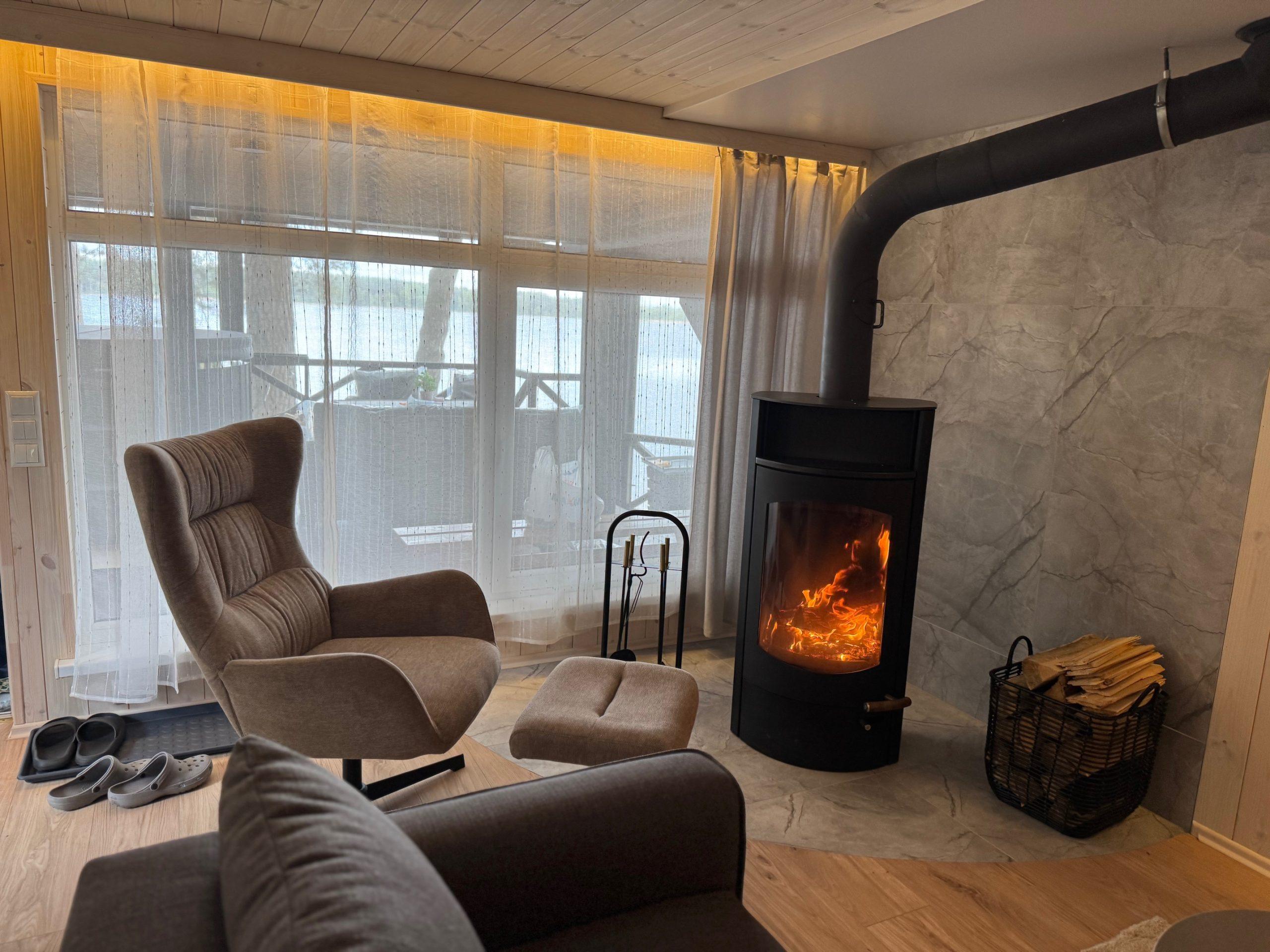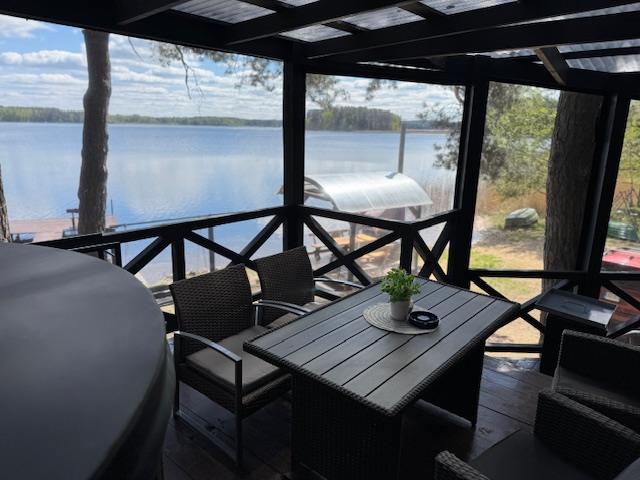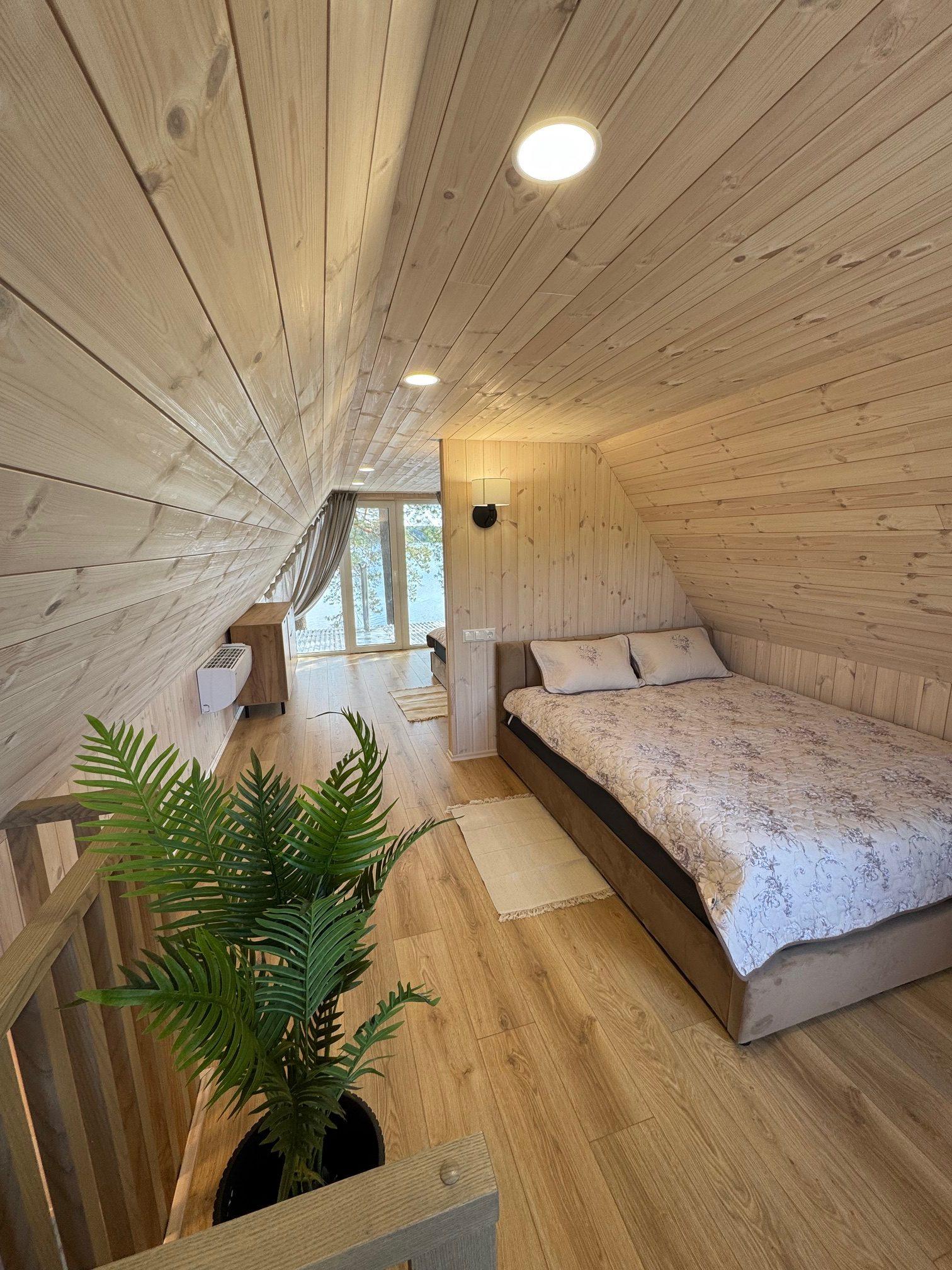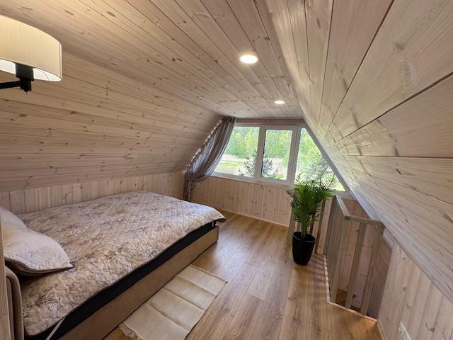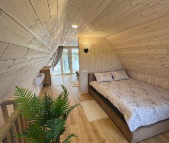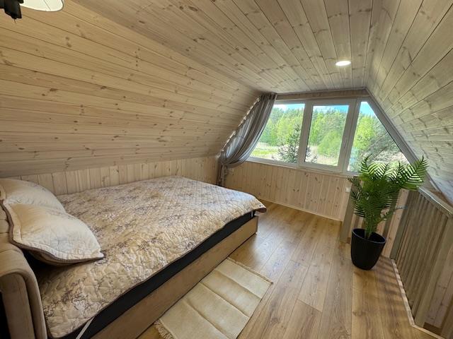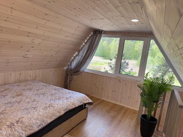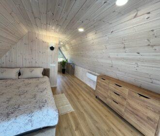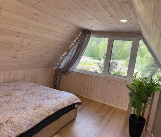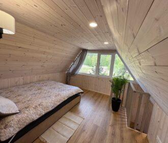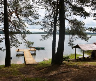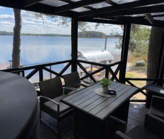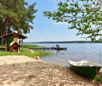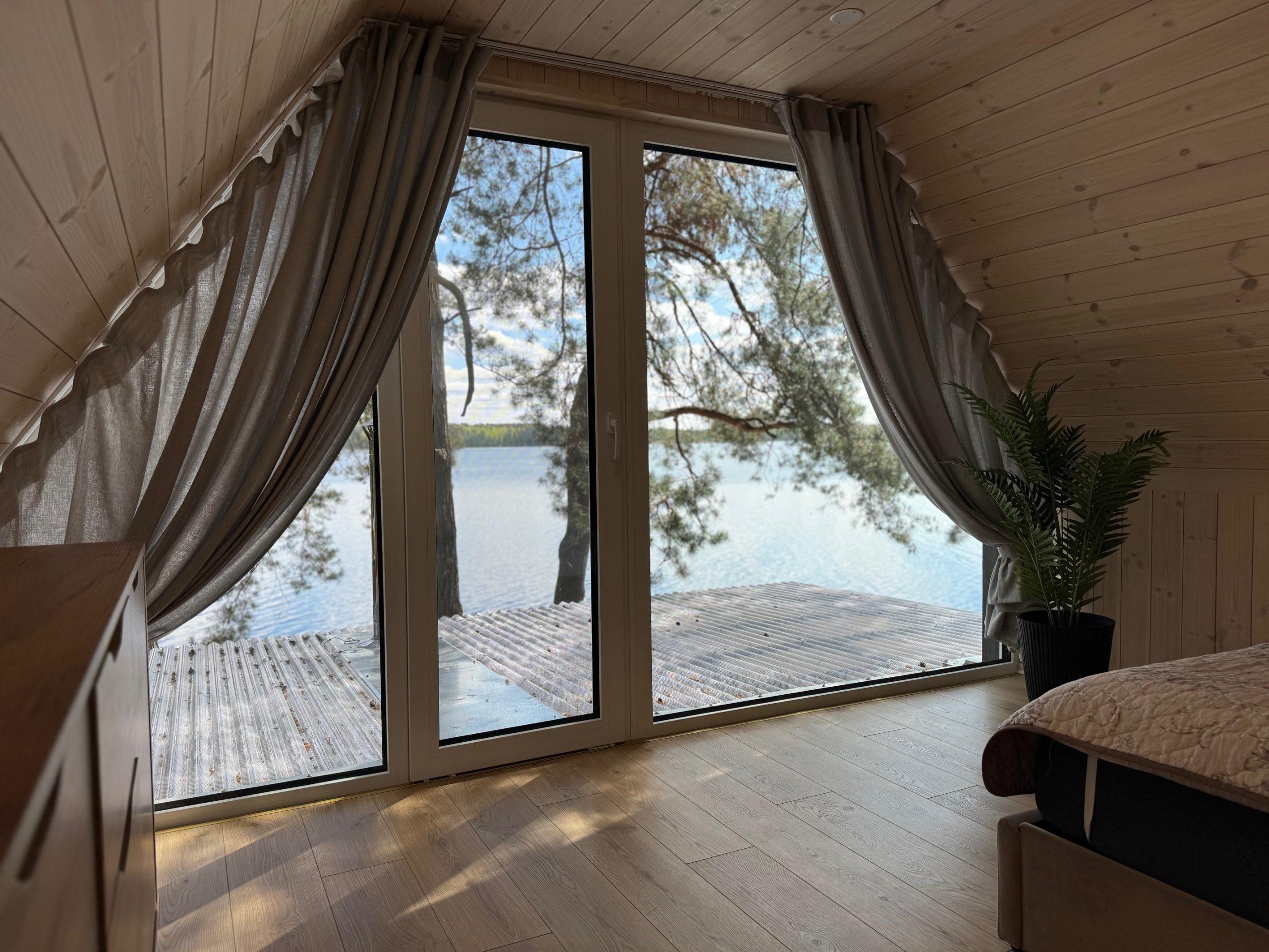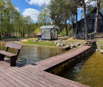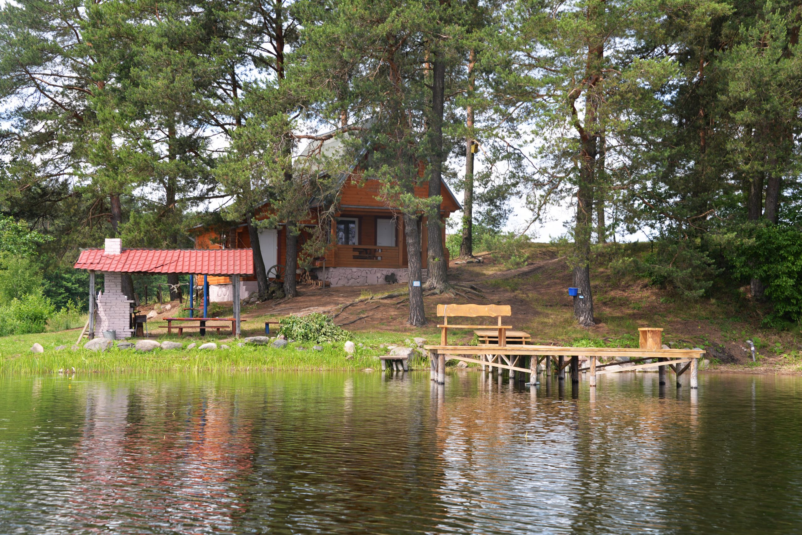 Visiškai ant ežero kranto su privačia pakrante. Pirmame aukšte svetainė, virtuvė, tualetas dušas. Yra židinys, televizorius, internetas, įrengtas kondicionierius. Antrame aukšte vienas kambarys – 4 miegamos vietos (2 dvigulės lovos). Yra pirtis ir kubilas. Duodama šašlykinė, iešmai, malkos.