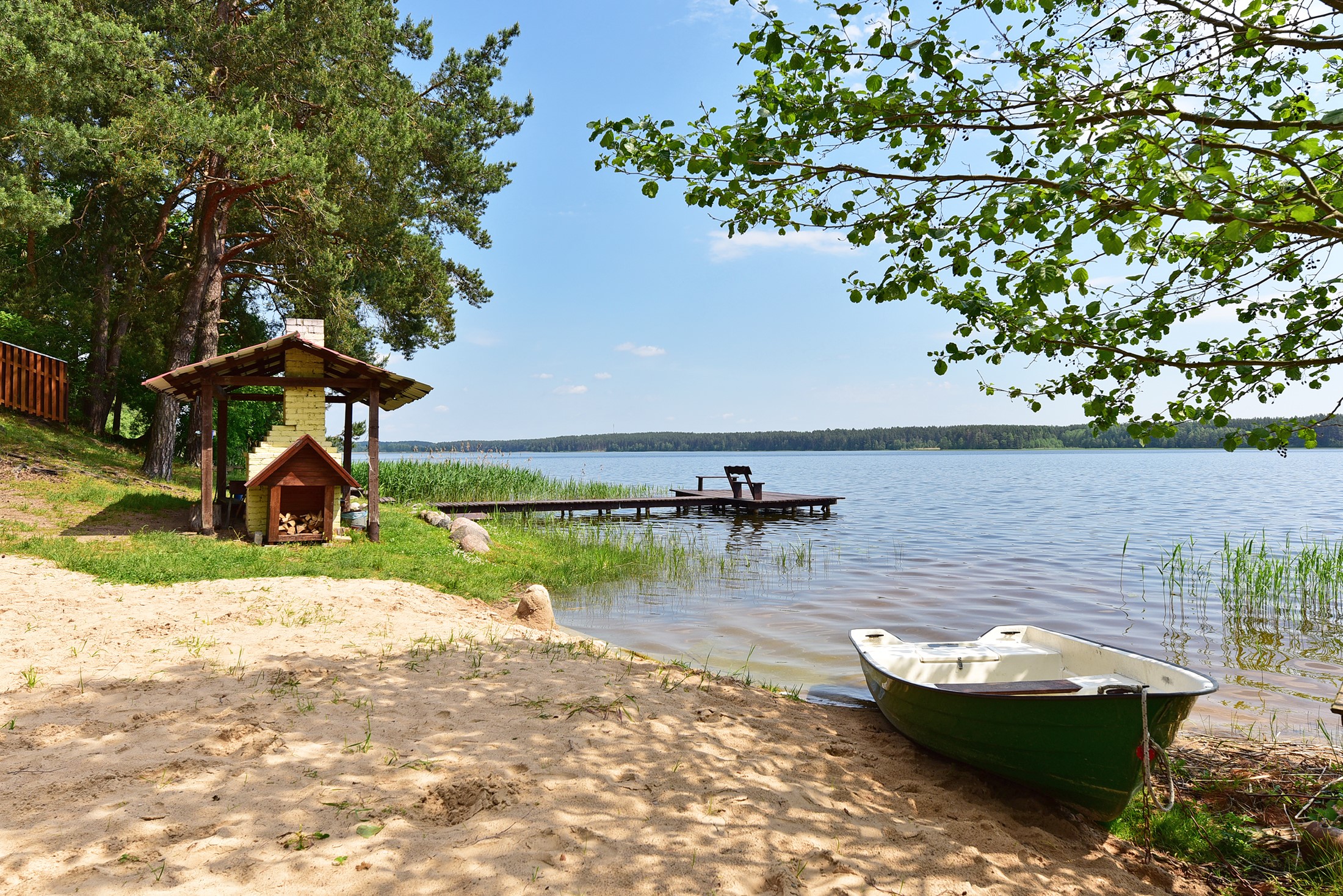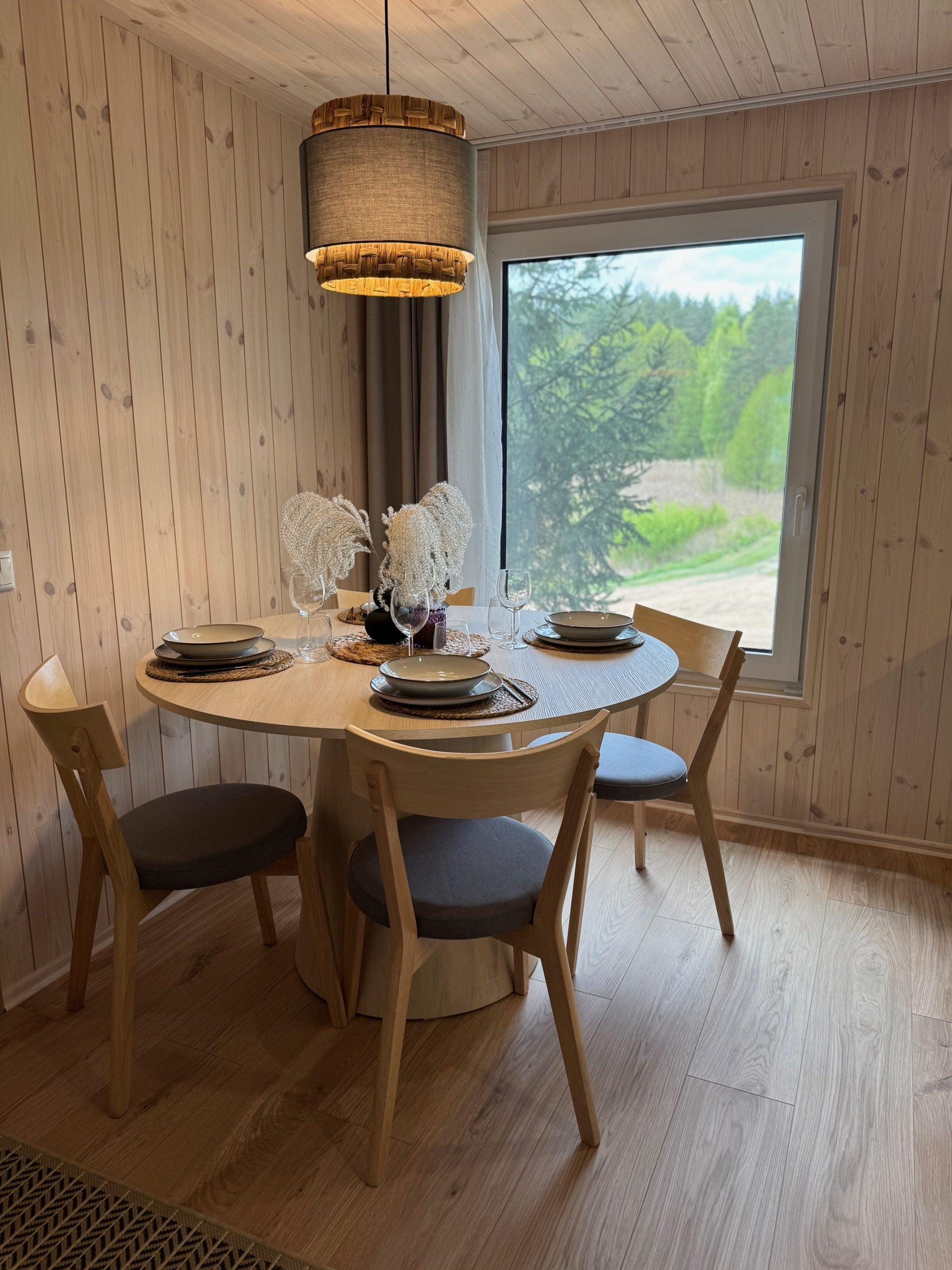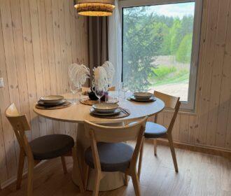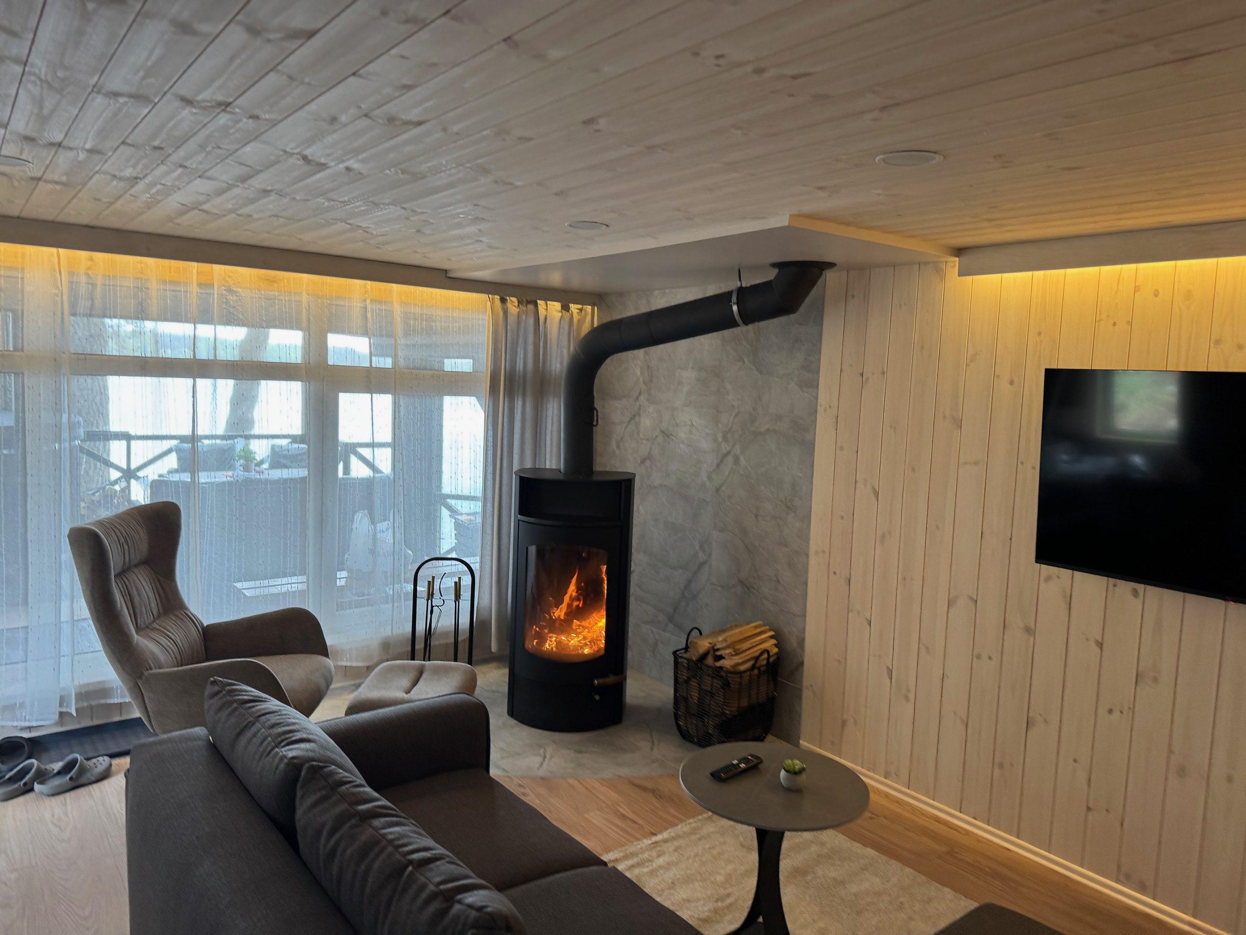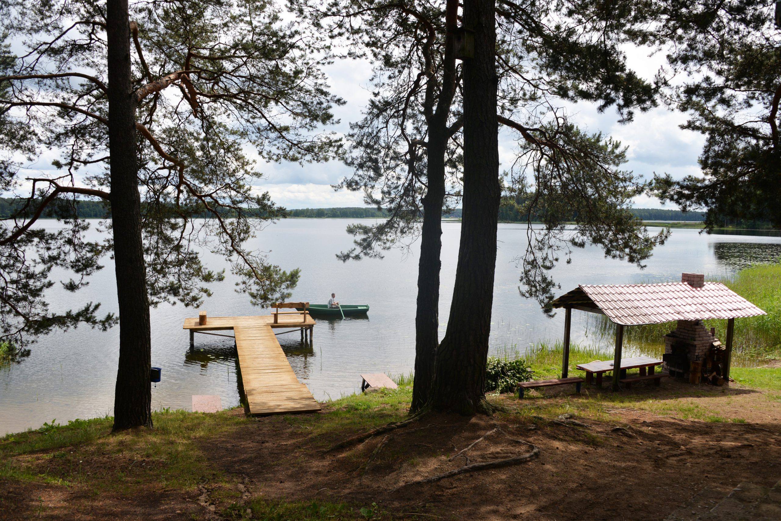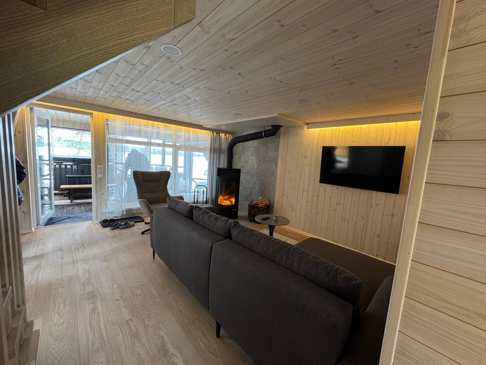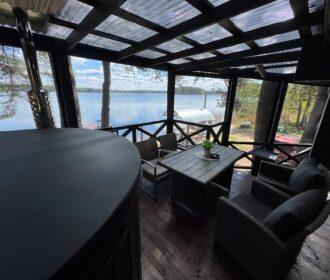Visiškai ant ežero kranto su privačia pakrante. Pirmame aukšte svetainė, virtuvė, tualetas dušas. Yra židinys, televizorius, internetas, įrengtas kondicionierius. Antrame aukšte vienas kambarys – 4 miegamos vietos (2 dvigulės lovos). Yra pirtis ir kubilas. Duodama šašlykinė, iešmai, malkos.