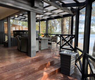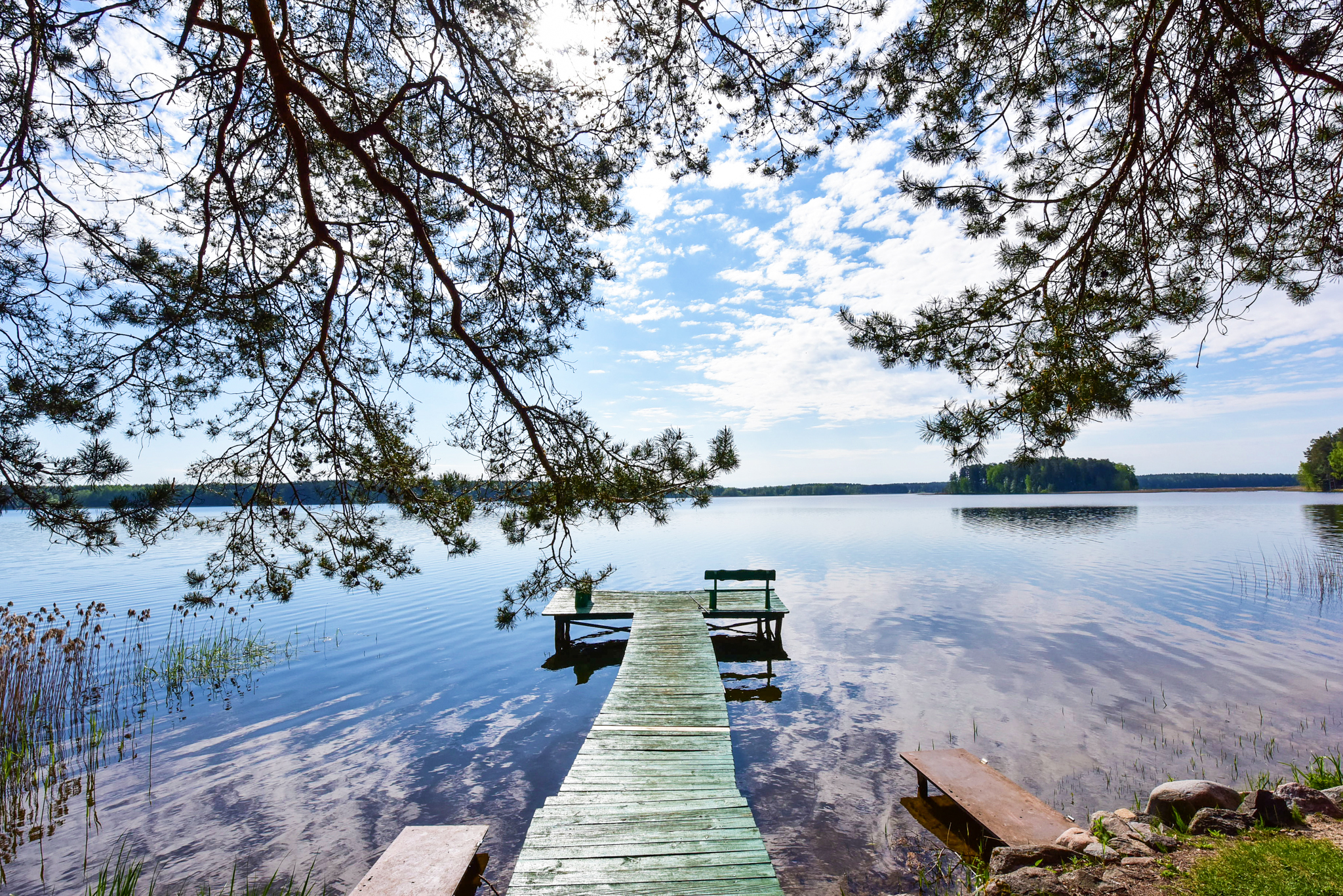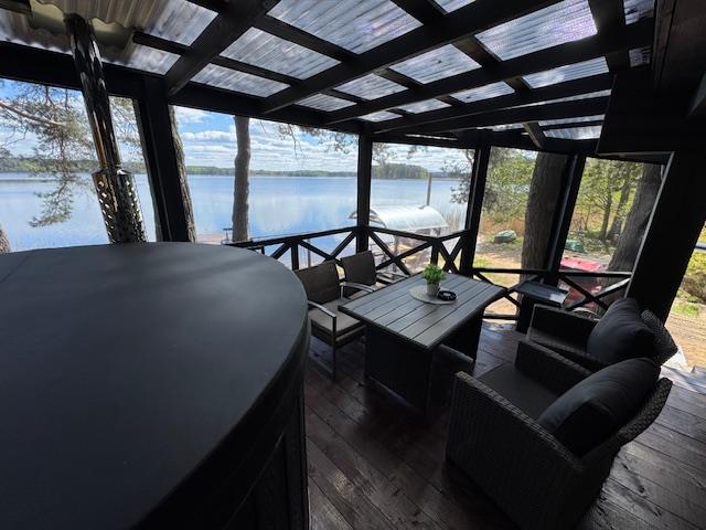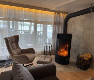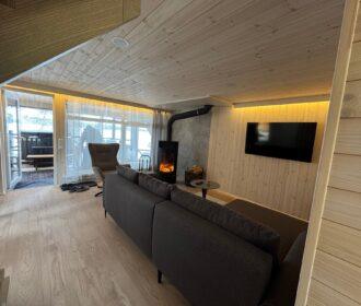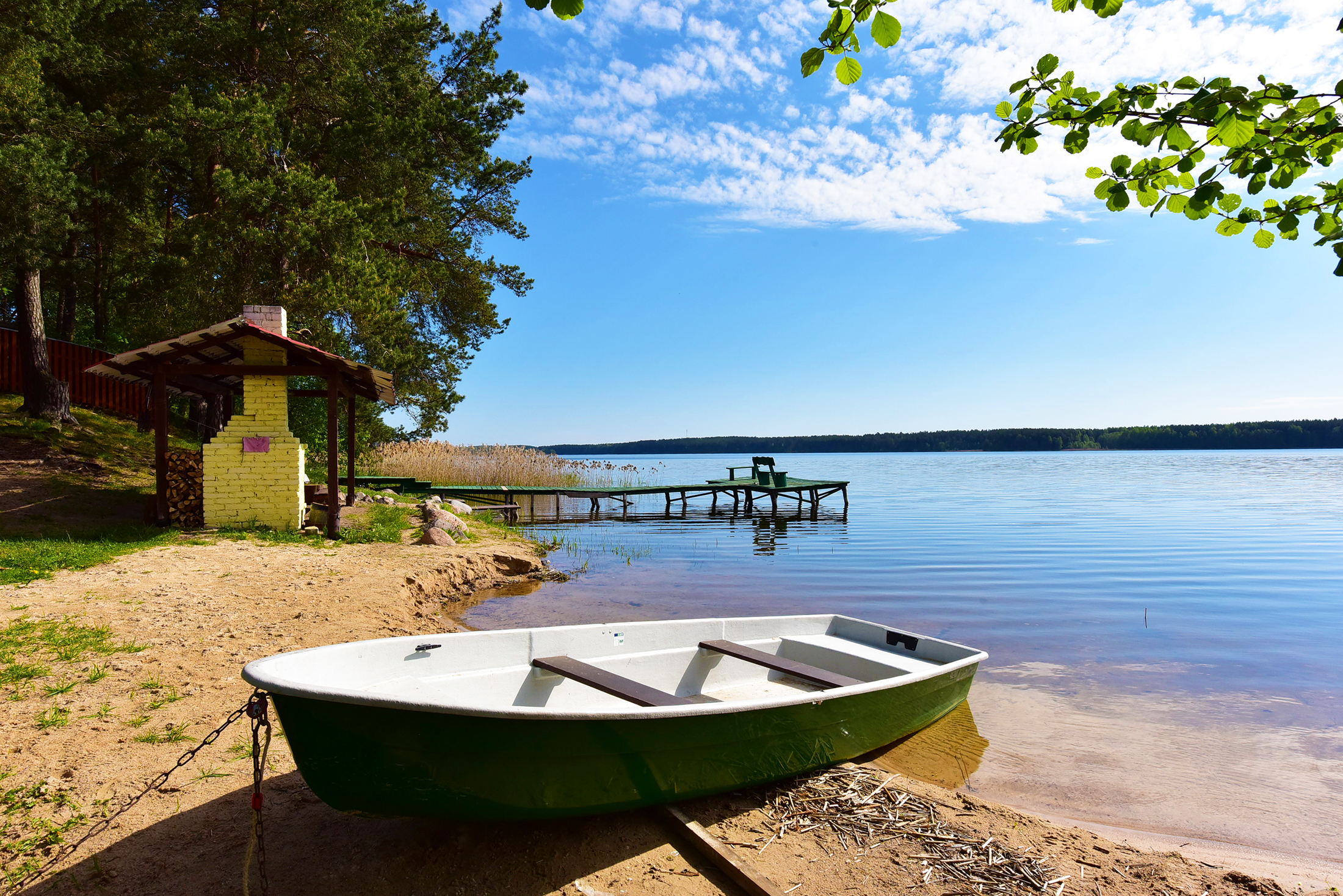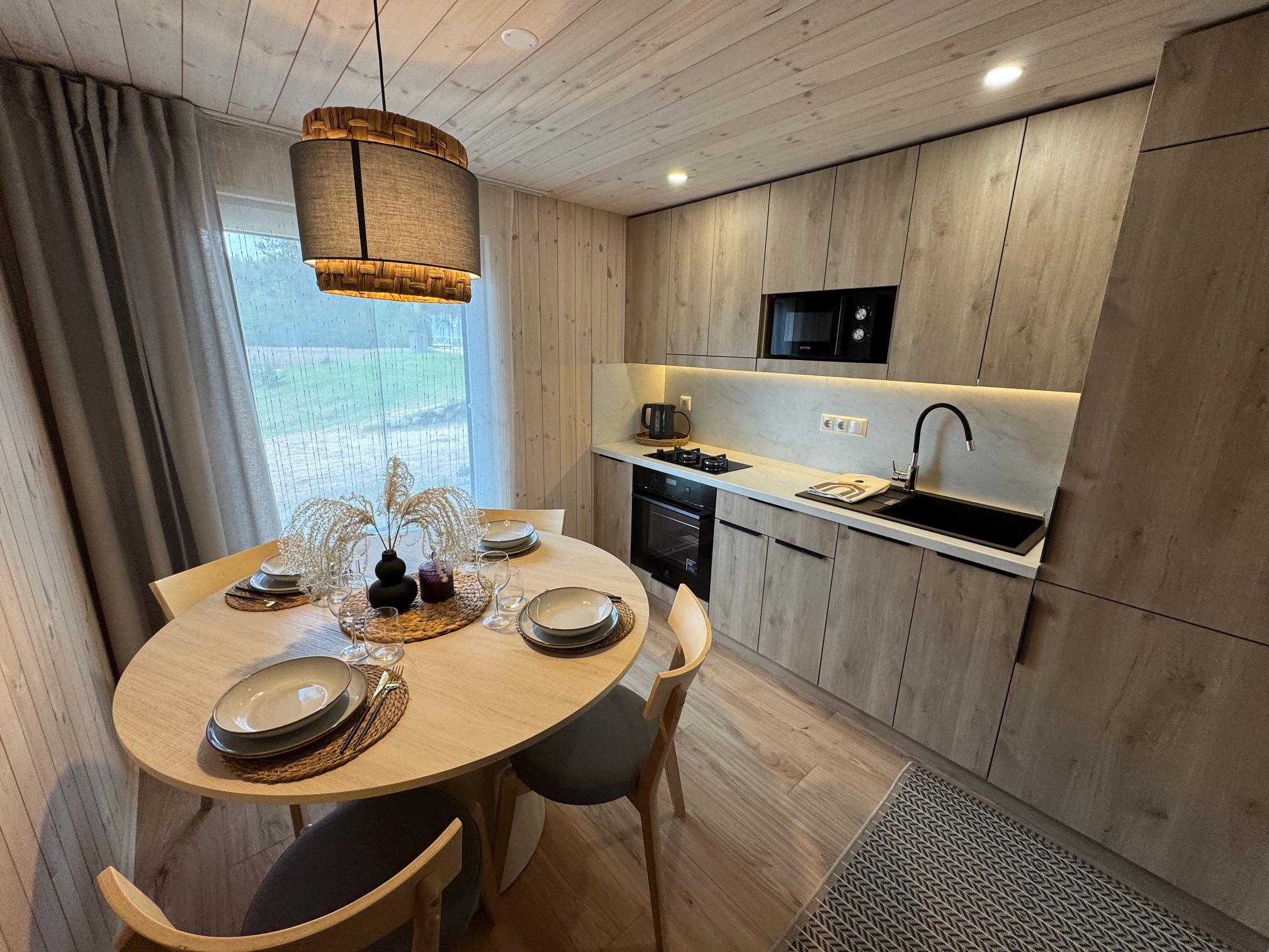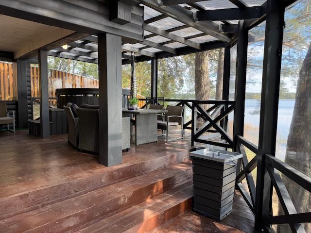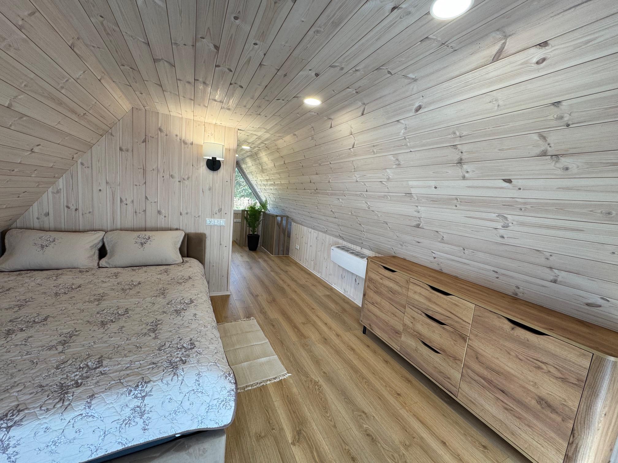 Visiškai ant ežero kranto su privačia pakrante. Pirmame aukšte svetainė, virtuvė, tualetas dušas. Yra židinys, televizorius, internetas, įrengtas kondicionierius. Antrame aukšte vienas kambarys – 4 miegamos vietos (2 dvigulės lovos). Yra pirtis ir kubilas. Duodama šašlykinė, iešmai, malkos.