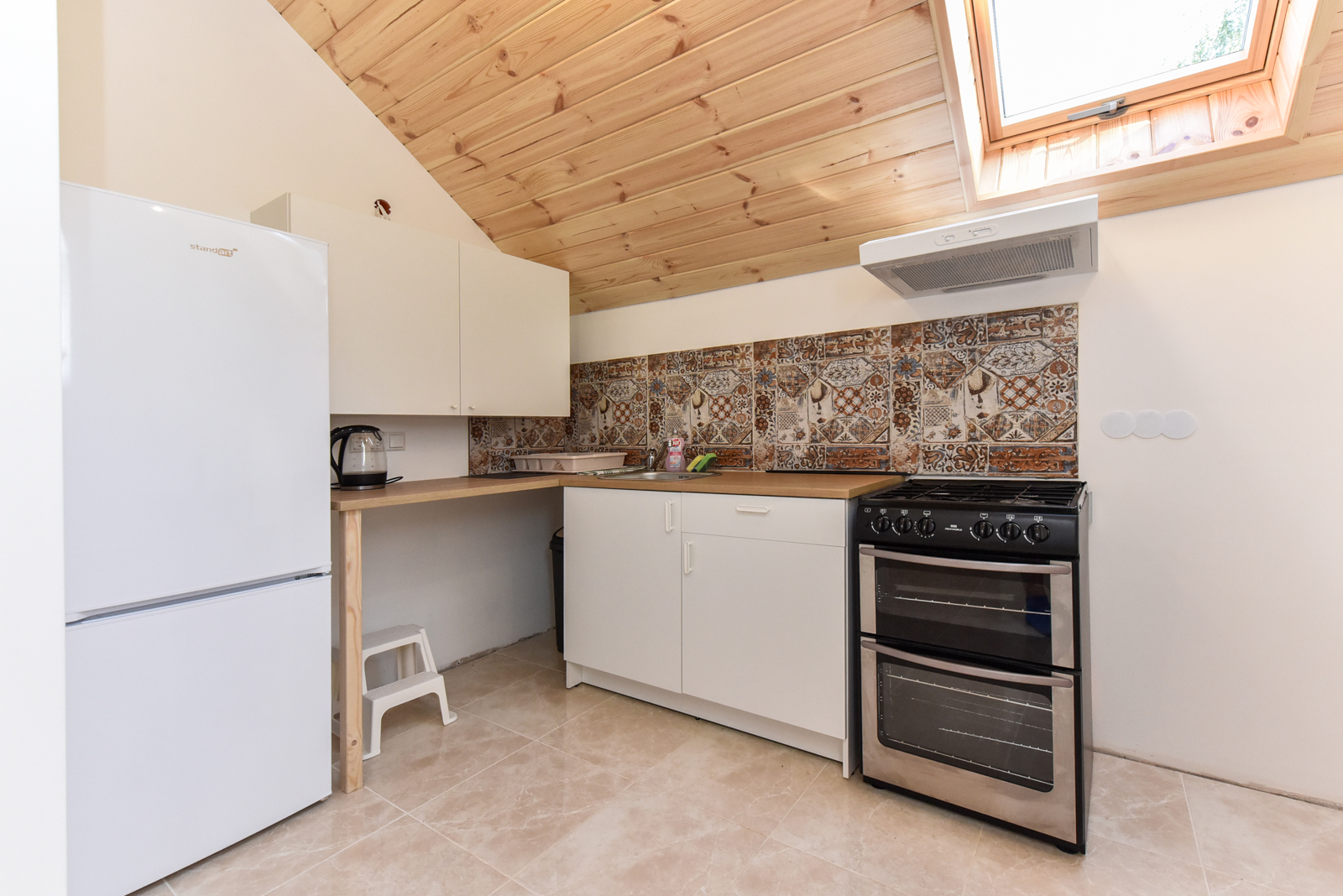 Dviejų aukštų kotedžiukas ant ežero kranto. Pirmame aukšte svetainė su virtuve, tualetas, dušas. Įrengtas grindinis šildymas. Stovi dvigulė lova, sofa lova, valgomasis stalas. Antrame aukšte dvi dvigulės lovos. Viso kotedžiuke 8 miegamos vietos. Yra televizorius, internetas, įrengtas kondicionierius. Įrengta erdvi terasa su kubilu, iš terasos nusileidimas laiptais iki pat ežero. Lauke pavėsinė, kurioje telpa 6-8 žmonės. Šalia vaikų žaidimų aikštelė. Įrengtas krantas maudytis bei keturi lieptai. Pakrante ir lieptais naudojasi 7A, 7B, 7C, 7D kotedžiukų gyventojai.