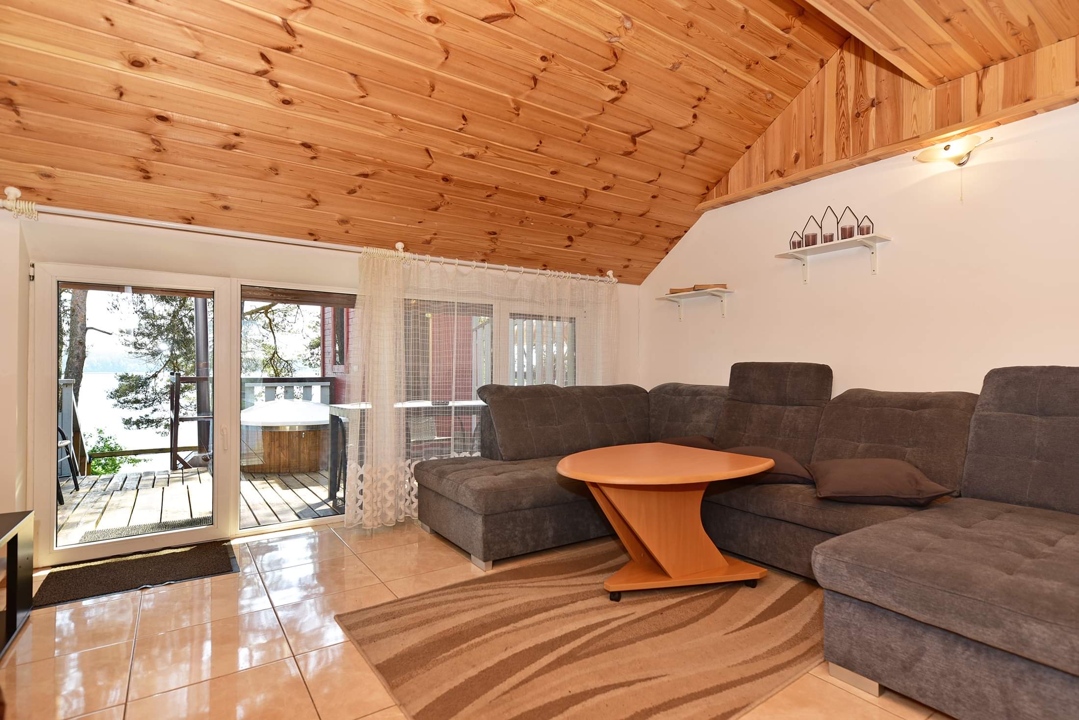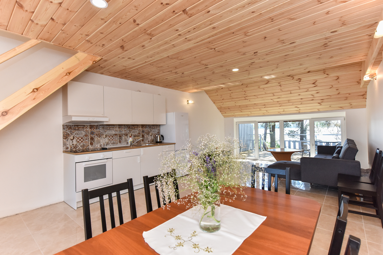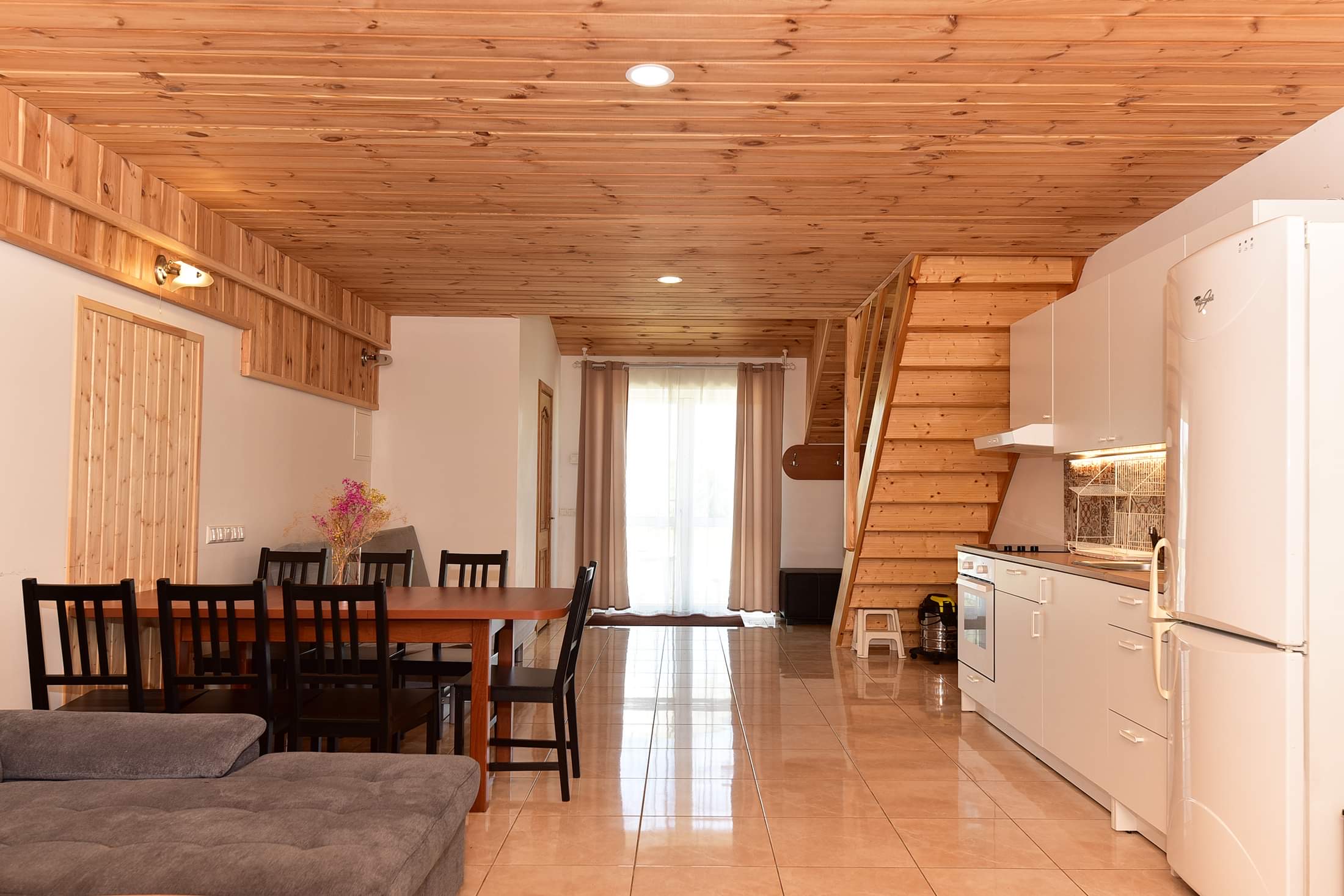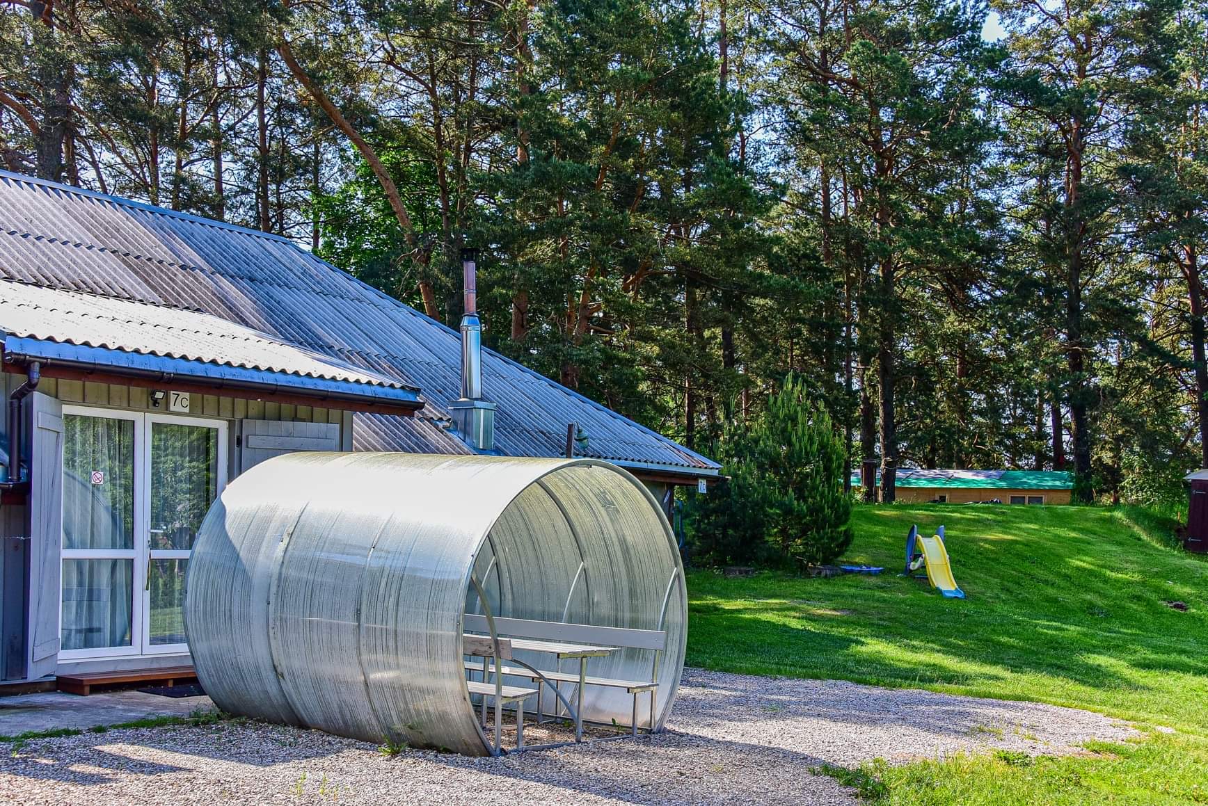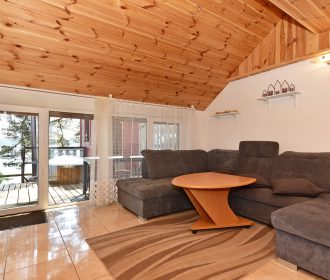 Dviejų aukštų kotedžiukas ant ežero kranto. Pirmame aukšte svetainė su virtuve, tualetas, dušas. Įrengtas grindinis šildymas. Stovi minkštas kampas, valgomasis stalas. Antrame aukšte viena dvigulė ir viena viengulė lovos. Viso kotedžiuke 5 miegamos vietos. Yra televizorius, internetas. Įrengtas kondicionierius. Įrengta terasa su kubilu ir pirtimi. Iš terasos nusileidimas laiptais iki pat ežero. Lauke pavėsinė, kurioje telpa 5 žmonės. Šalia vaikų žaidimų aikštelė. Įrengtas krantas maudytis bei keturi lieptai. Pakrante ir lieptais naudojasi 7A, 7B, 7C, 7D kotedžiukų gyventojai.
