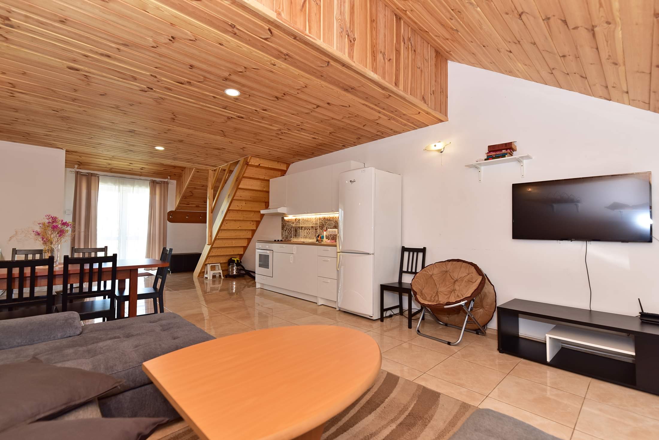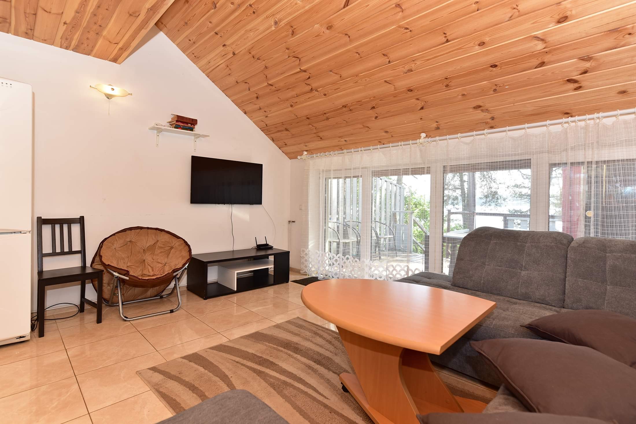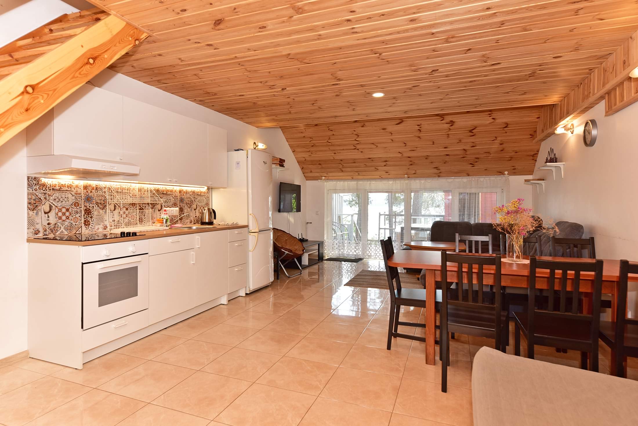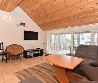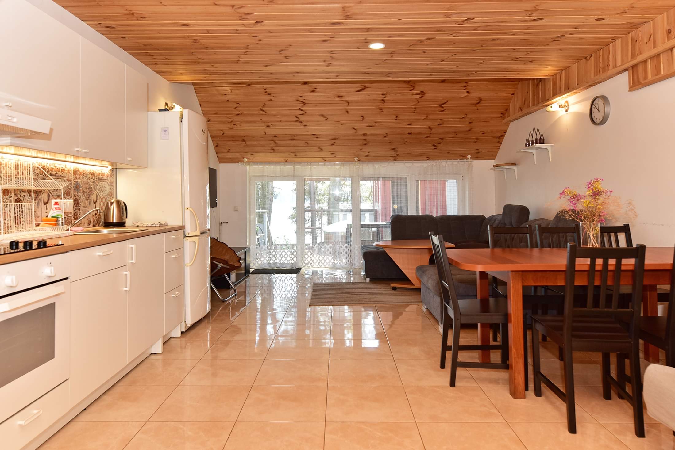Dviejų aukštų kotedžiukas ant ežero kranto. Pirmame aukšte svetainė su virtuve, tualetas, dušas. Įrengtas grindinis šildymas. Stovi minkštas kampas, valgomasis stalas. Antrame aukšte viena dvigulė ir viena viengulė lovos. Viso kotedžiuke 5 miegamos vietos. Yra televizorius, internetas. Įrengtas kondicionierius. Įrengta terasa su kubilu ir pirtimi. Iš terasos nusileidimas laiptais iki pat ežero. Lauke pavėsinė, kurioje telpa 5 žmonės. Šalia vaikų žaidimų aikštelė. Įrengtas krantas maudytis bei keturi lieptai. Pakrante ir lieptais naudojasi 7A, 7B, 7C, 7D kotedžiukų gyventojai.