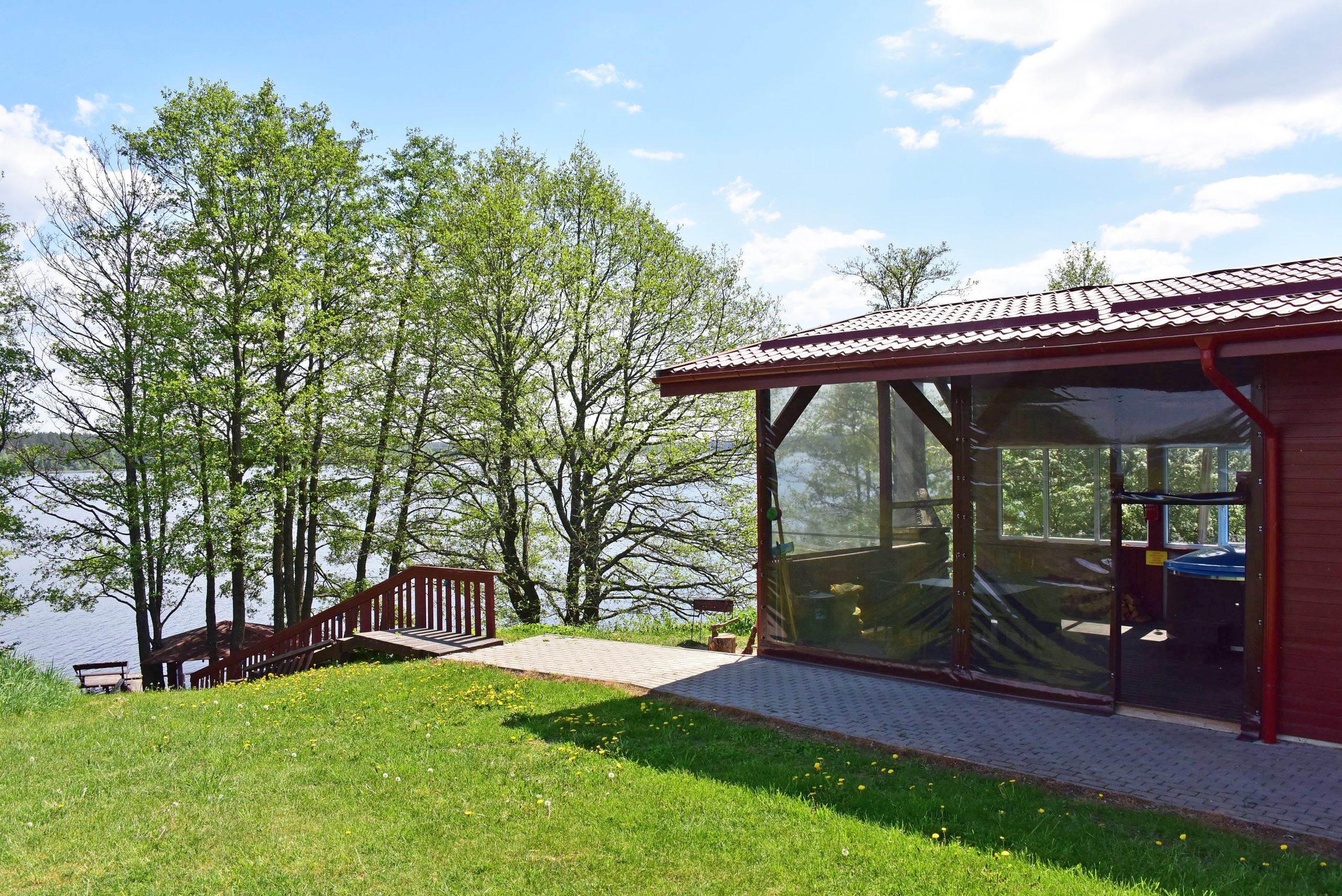 Didelė lauko terasa, kurioje įrengas kubilas su oro ir hidro masažu bei led apšvietimu, garinė pirtis, židinys, lauko baldai. Graži panorama į ežerą.