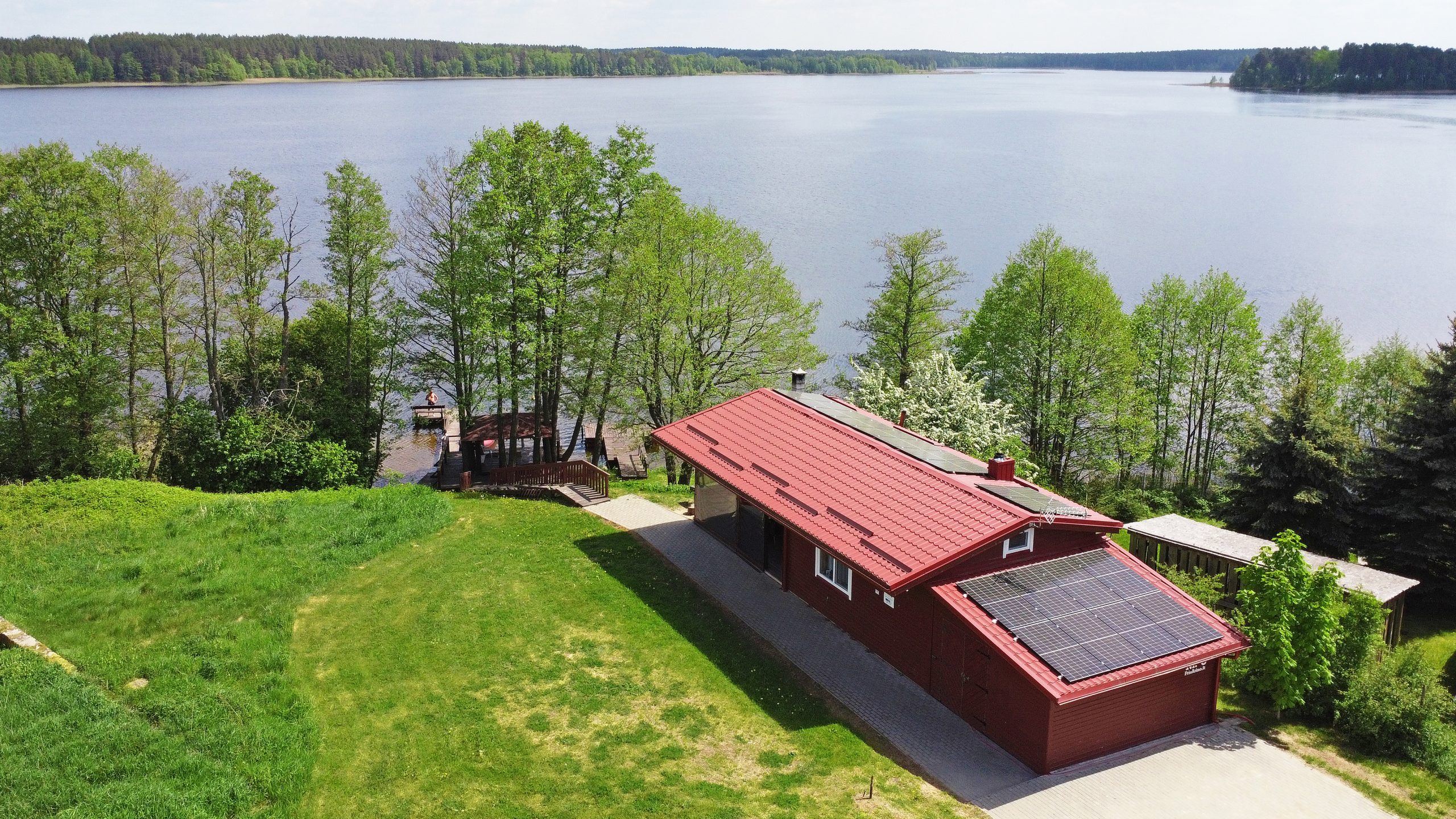Pakrantėje pavėsinė, du lieptai. PAKRANTE NAUDOJASI DVIEJŲ NAMELIŲ GYVENTOJAI. Palei šį namelį praeina kito namelio gyventojai iki kranto.